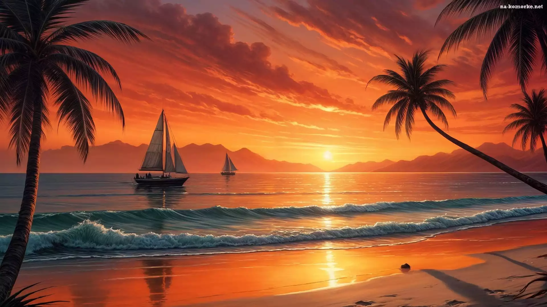Żaglówki, Morze, Zachód Słońca, Grafika, Palmy, Plaża na Komórkę