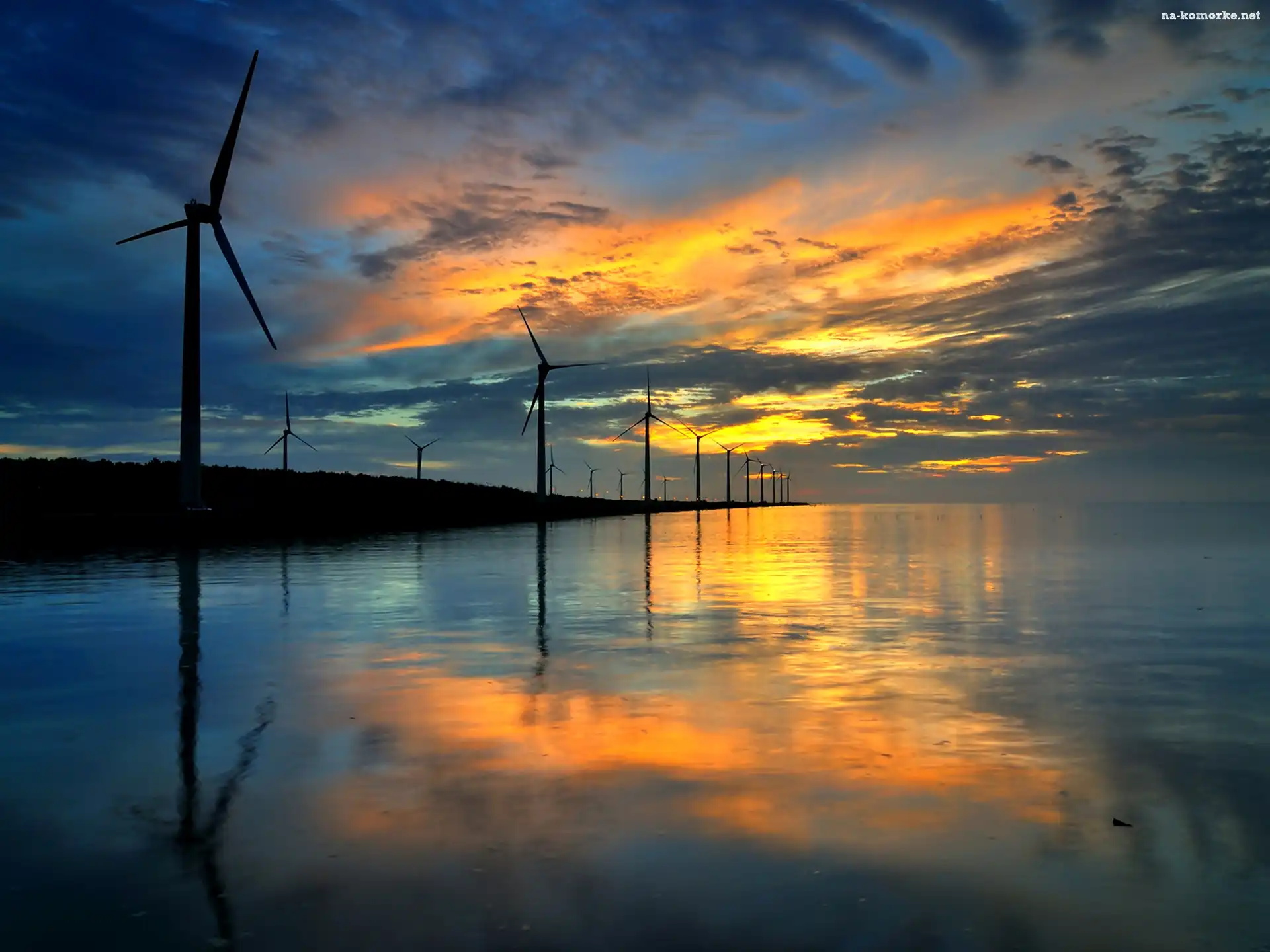 Słońca, Niebo, Morze, Wiatraki, Zachód, Odbicie na Komórkę