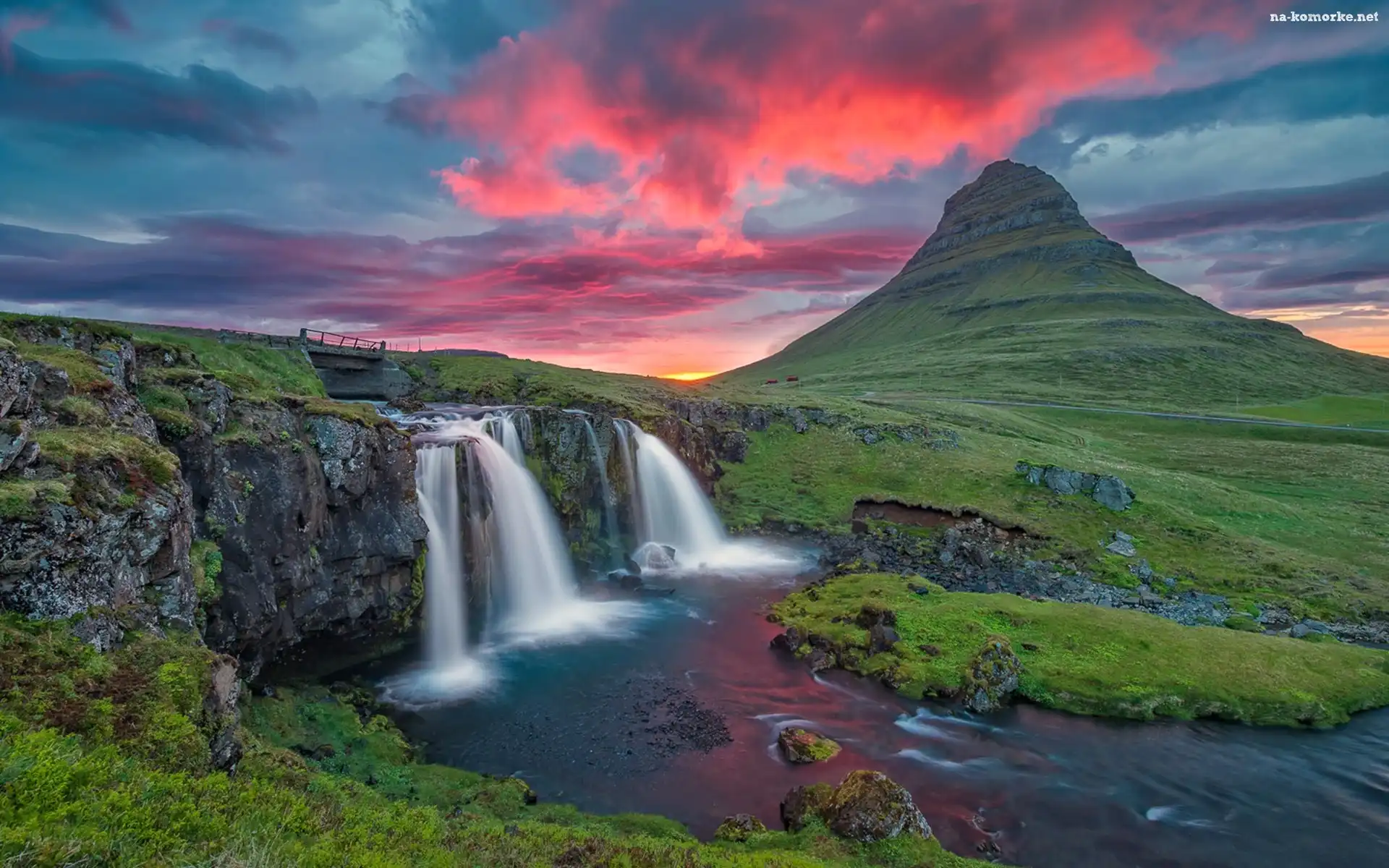 Zachód Słońca, Rzeka, Wodospad, Islandia, Góry, Mostek na Komórkę