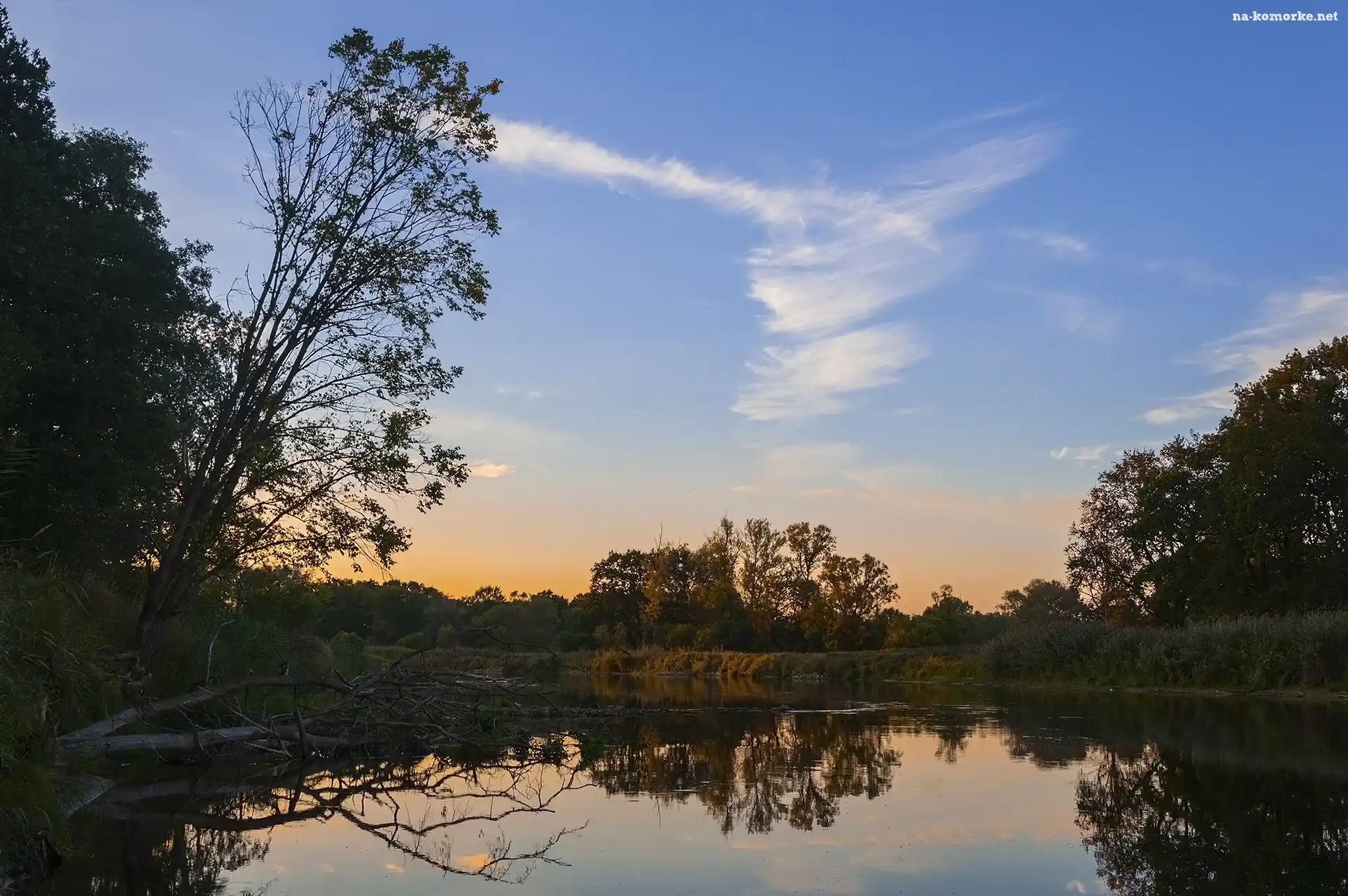 Zachód słońca, Warta, Rzeka, Chmura, Drzewa, Niebo na Komórkę