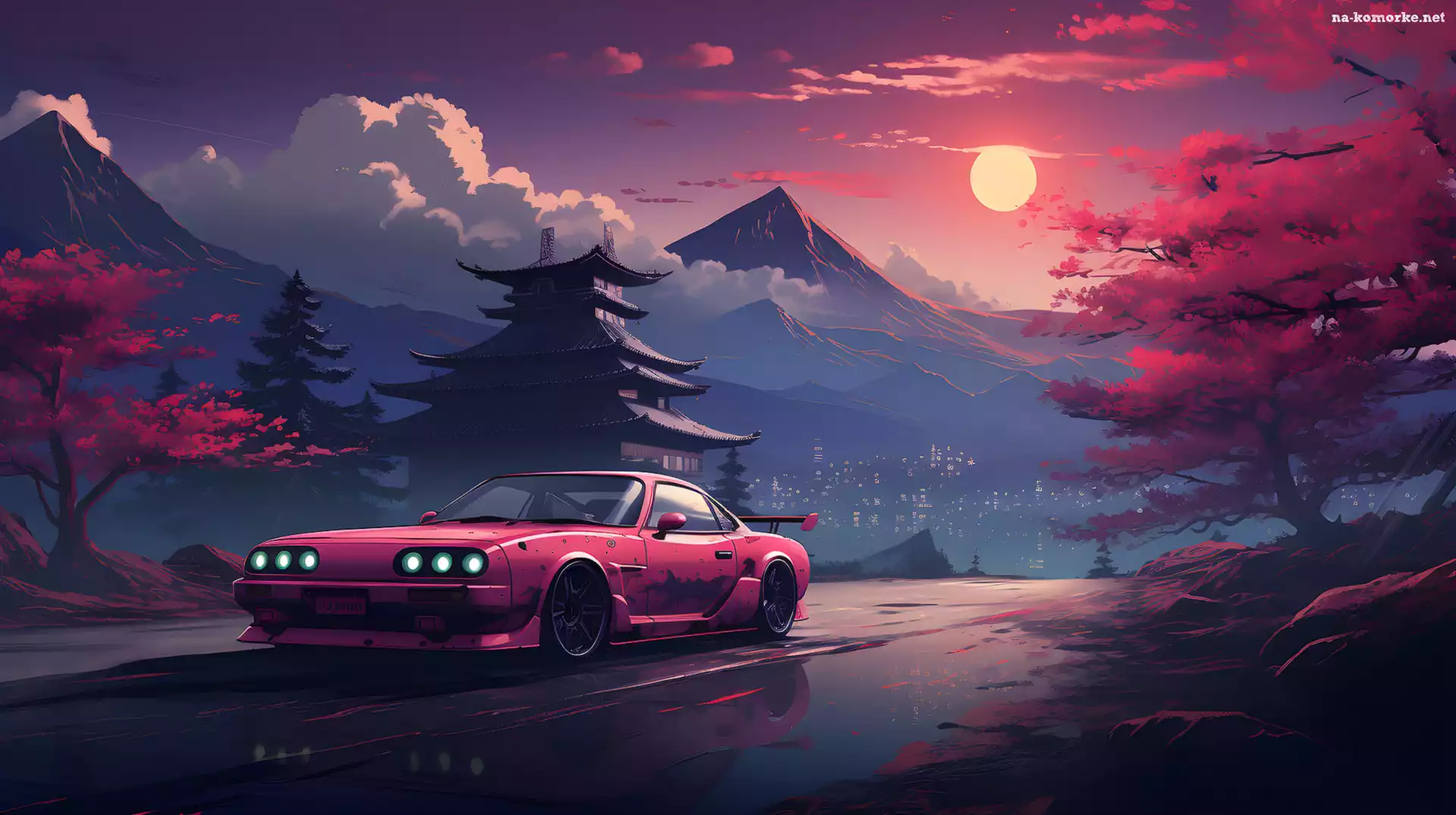 Drzewa, Samochód, Zachód słońca, Grafika, Góry, Droga na Komórkę