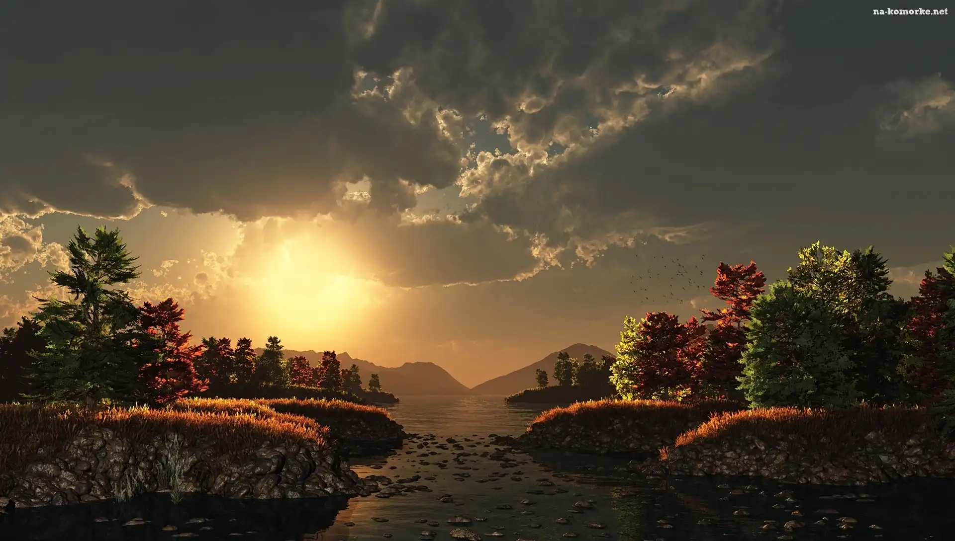 Słońca, Rzeki, Góry, Drzewa, Zachody, Kolorowe na Komórkę