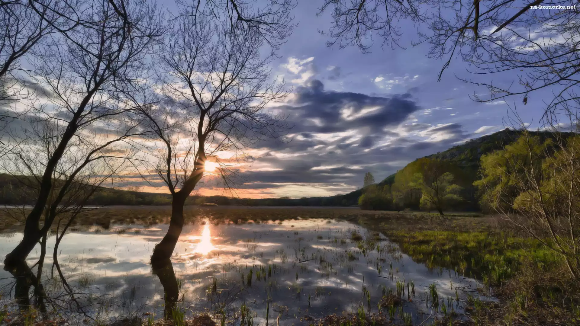 Słońce, Bagna, Drzewa, Łąka na Komórkę
