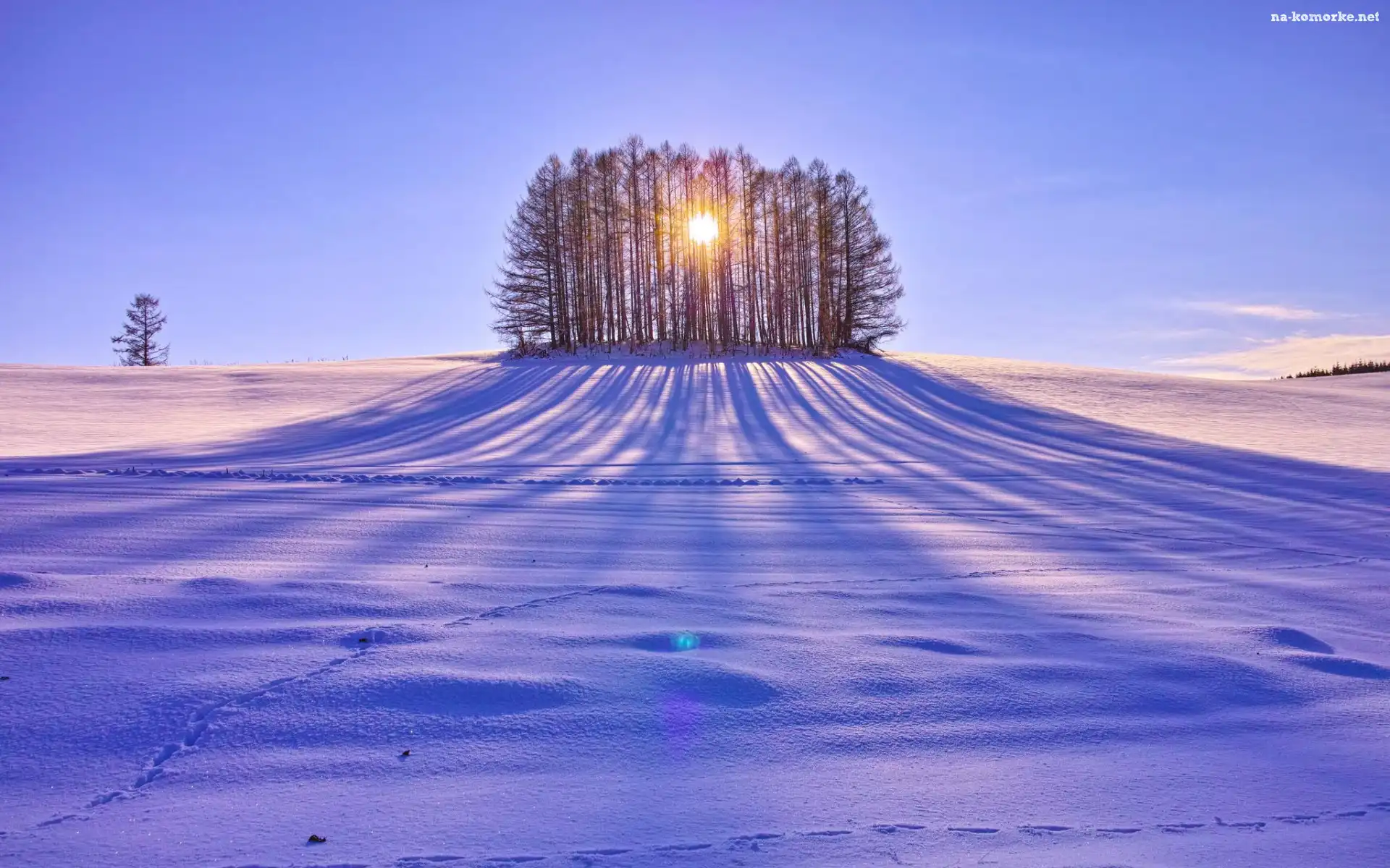 Słońce, Śnieg, Pole, Drzewa, Przebijające na Komórkę