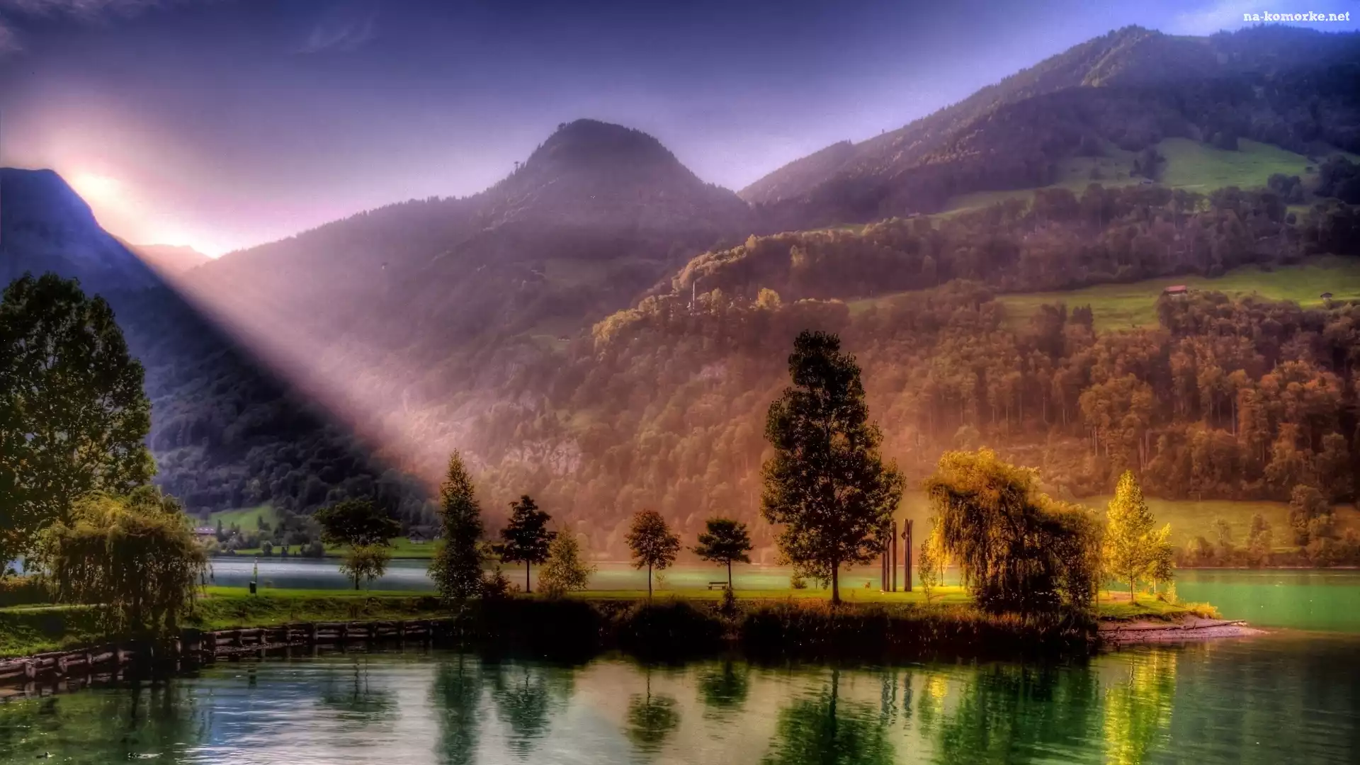 Słońce, Rzeka, Drzewa, Góry, Przebijające na Komórkę