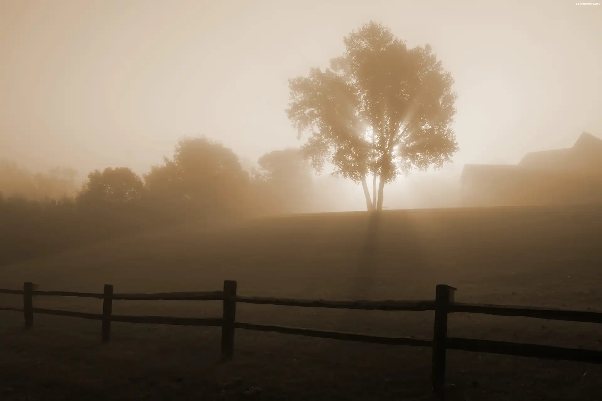 Słońce, Mgła, Drzewo, Ogrodzenie, Przebijające na Komórkę