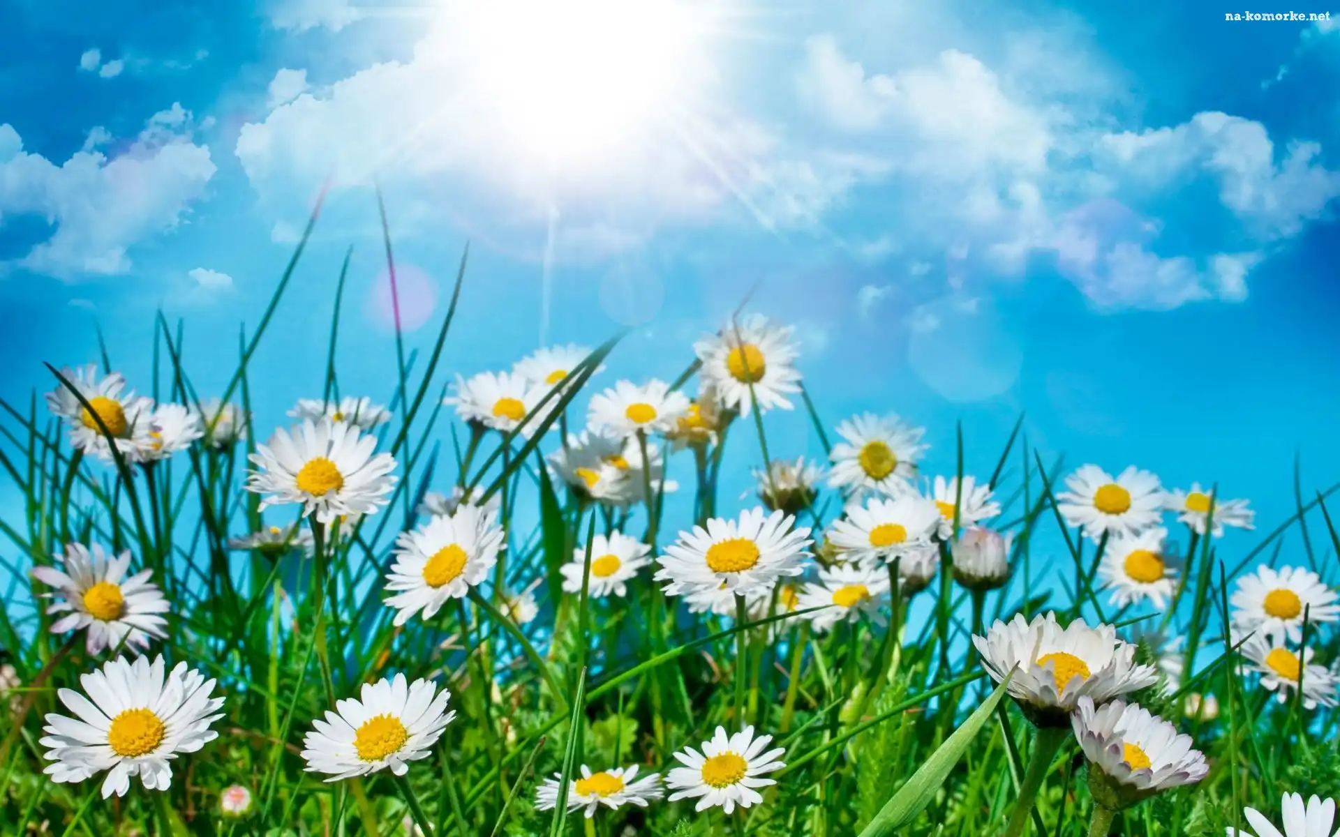 Słońce, Łąka, Stokrotki, Trawa, Chmury na Komórkę