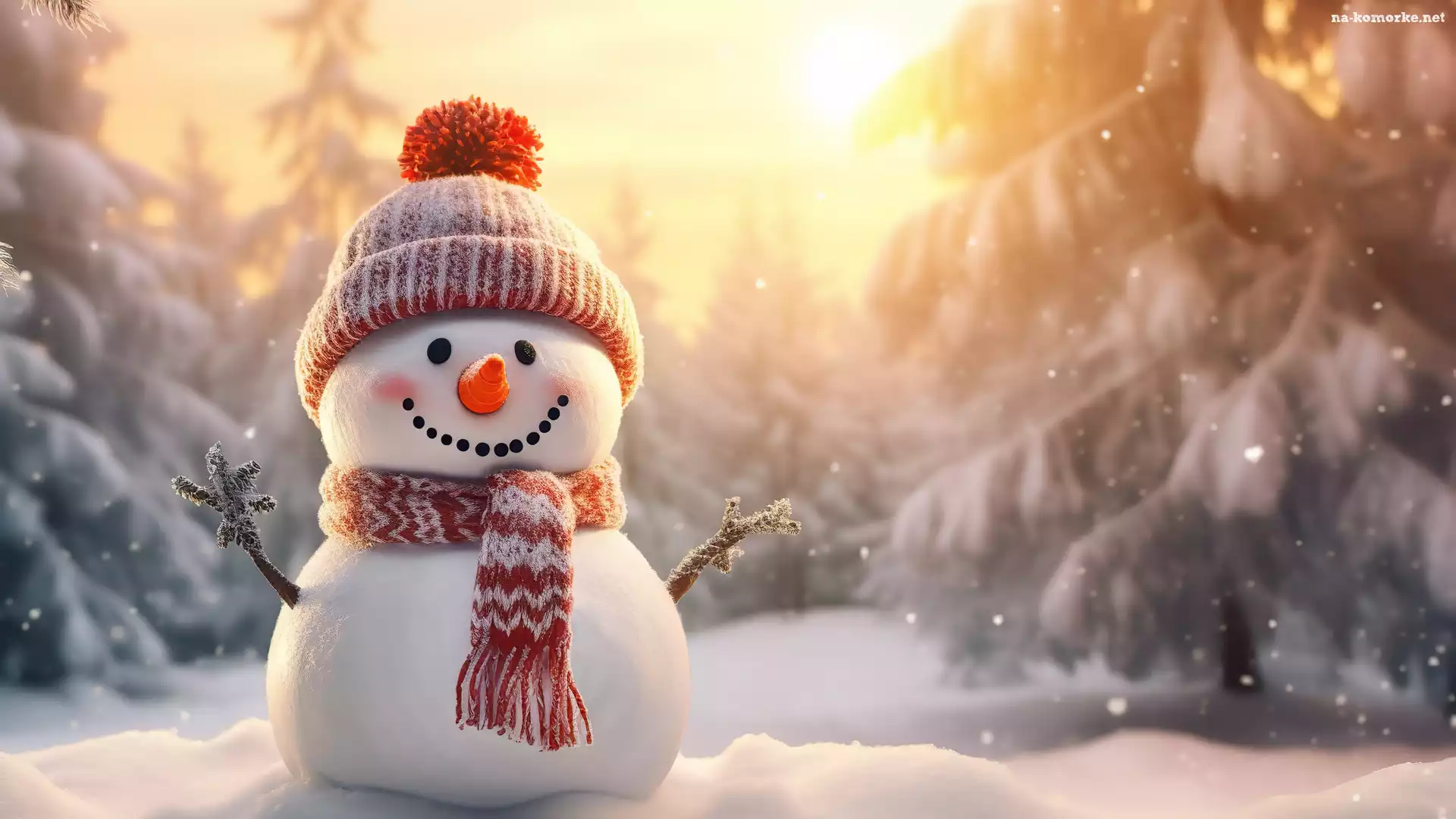 Śnieg, Drzewa, Zima, Słońce, Czapka, Szalik, Bałwan na Komórkę
