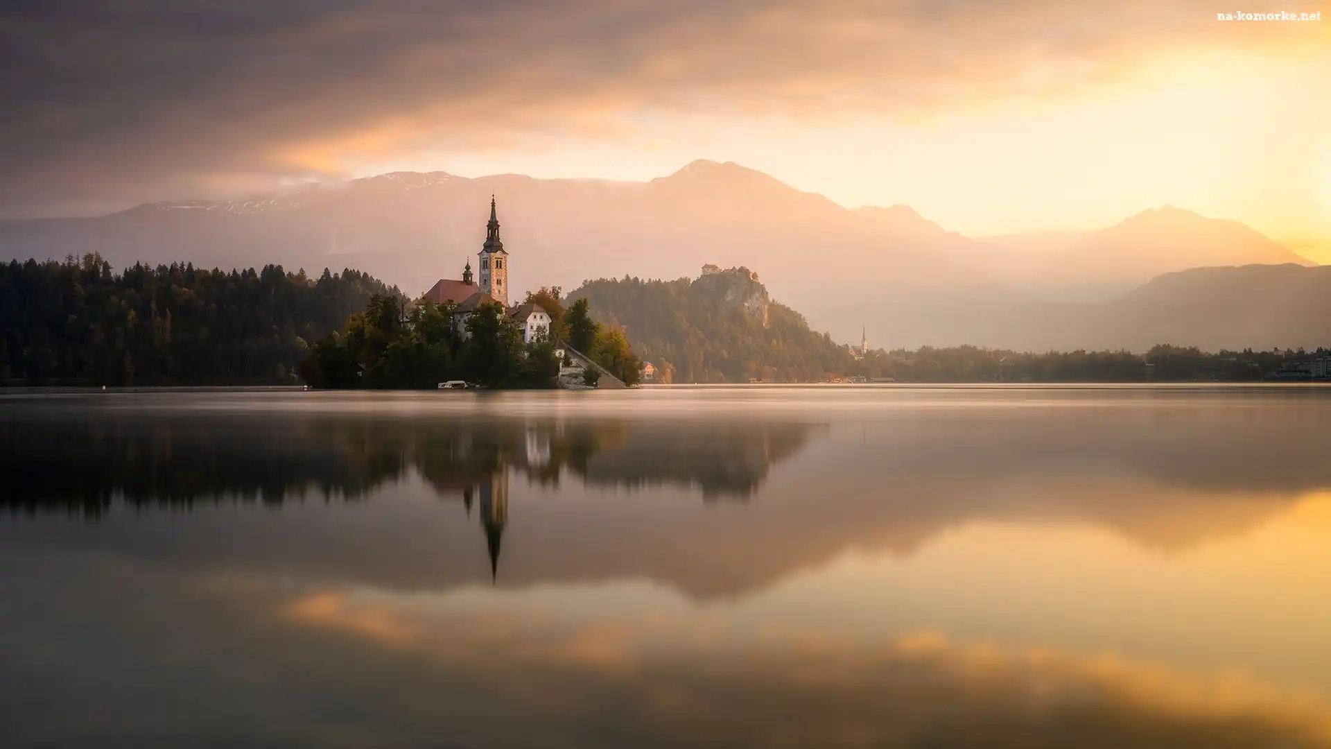 Słowenia, Alpy Julijskie, Wschód słońca, Jezioro Bled, Wyspa Blejski Otok, Kościół Zwiastowania Marii Panny, Góry na Komórkę |