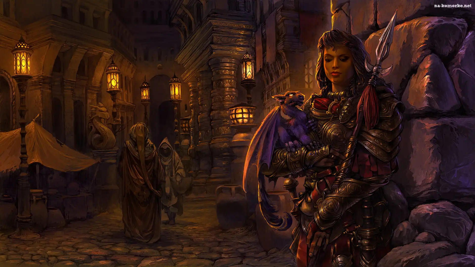 Fantasy, Smok, Uliczka, Dziewczyna, Wojowniczka, Zbroja, Włócznia na Komórkę