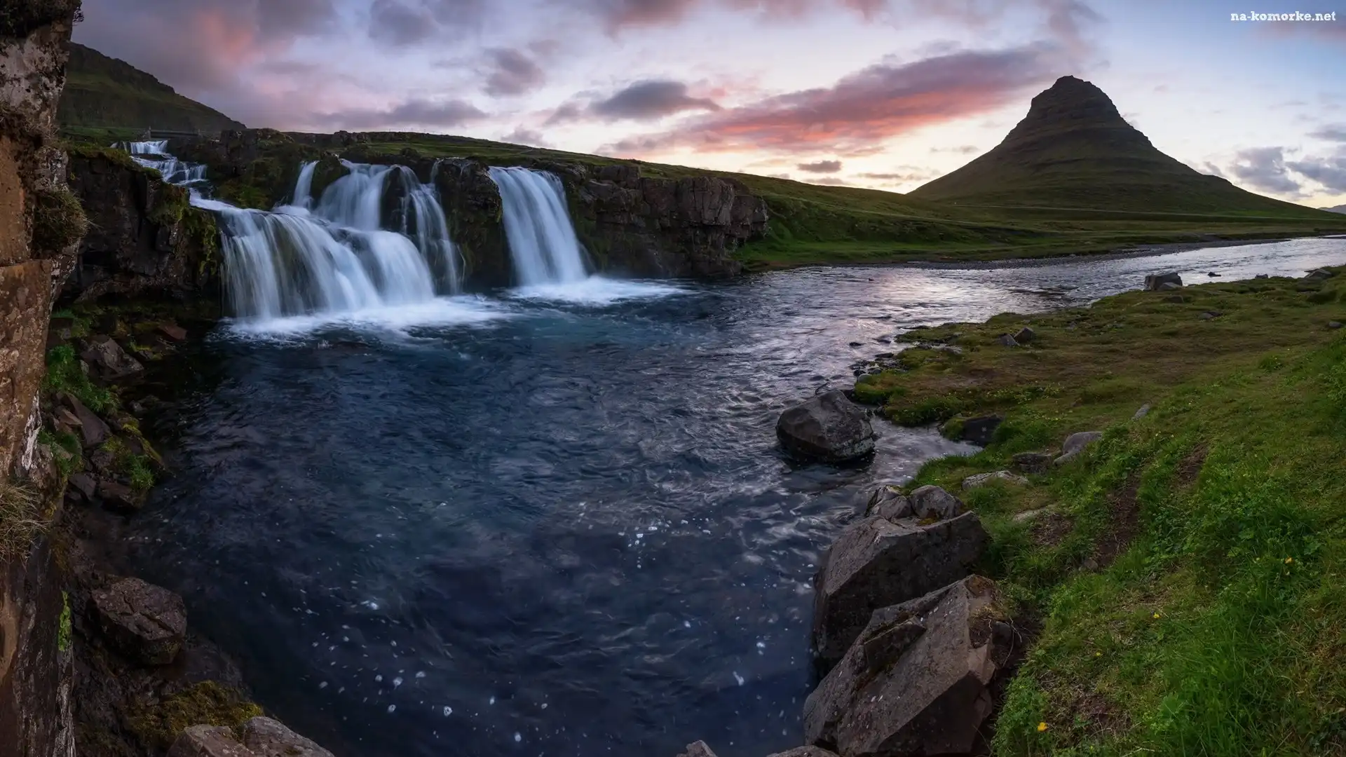 Chmury, Rzeka, Góra Kirkjufell, Islandia, Wodospad Kirkjufellsfoss, Półwysep Snaefellsnes na Komórkę |