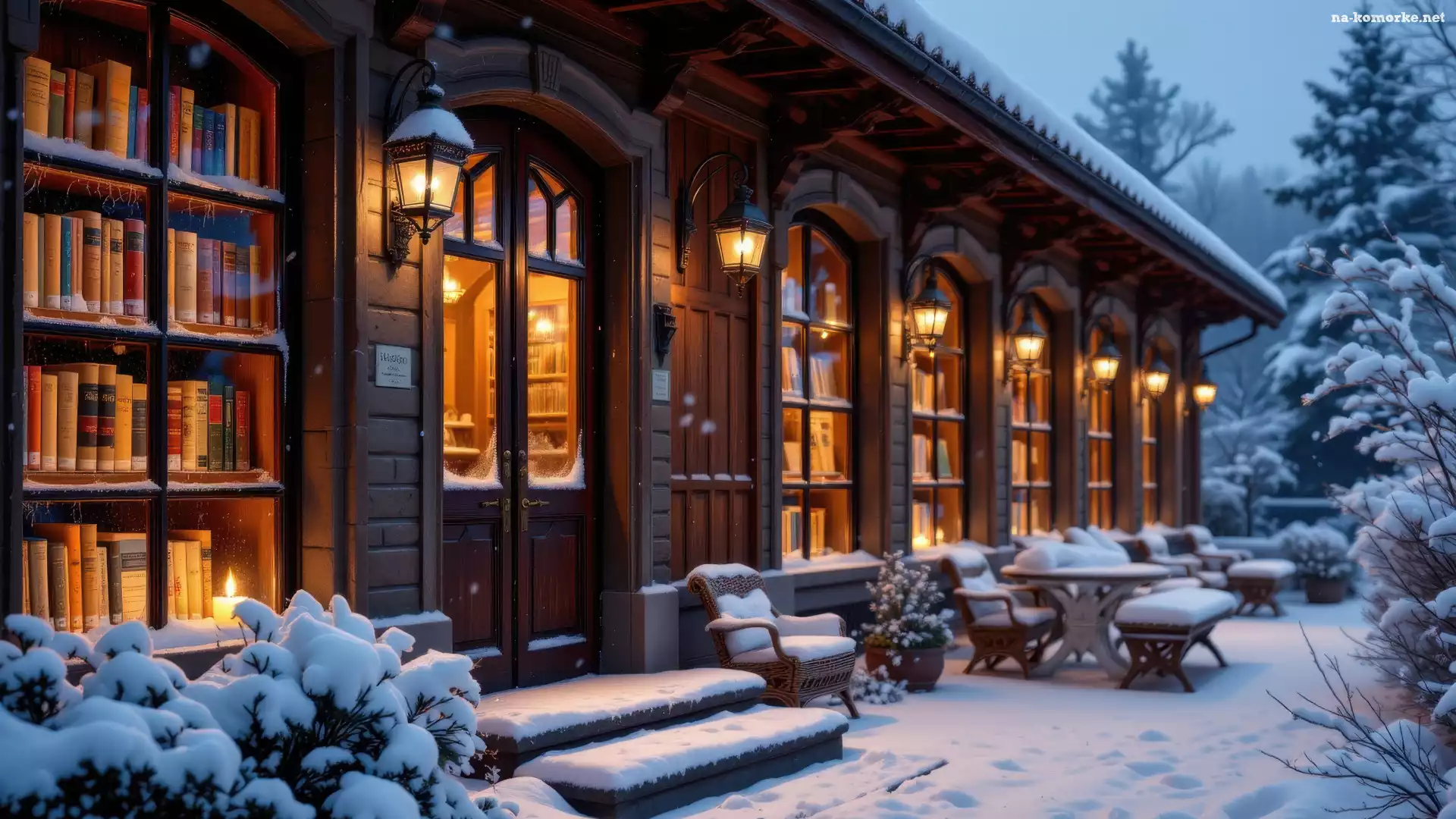 Śnieg, Krzesła, Ośnieżone, Książki, Drzewa, Zima, Biblioteka, Półki, Dom, AI na Komórkę