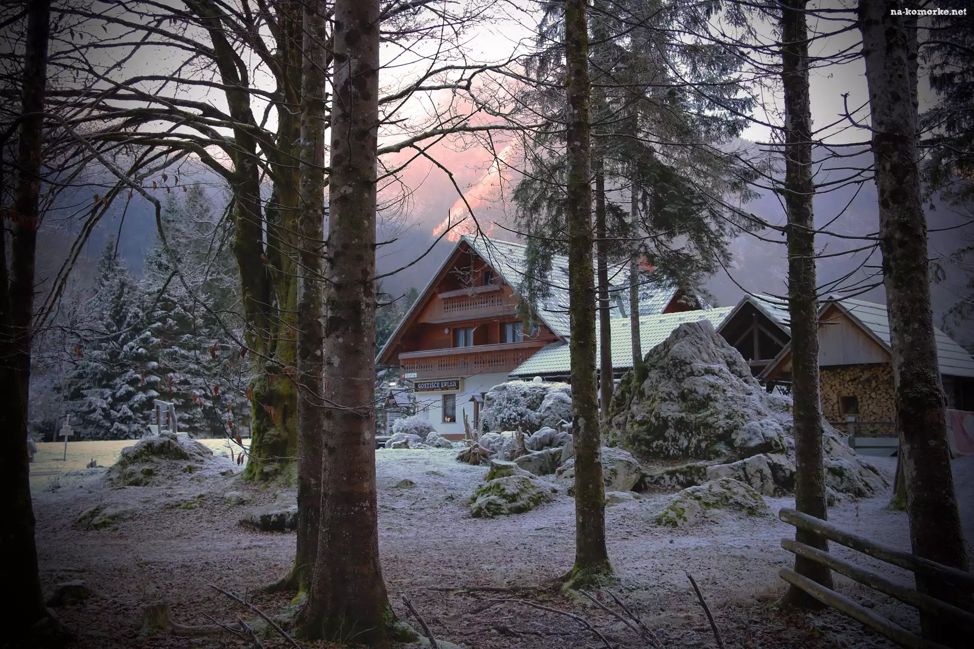 Bohinj, Krzewy, Gostišče Erlah, Zima, Drzewa, Śnieg, Domek gościnny Erlah, Słowenia na Komórkę