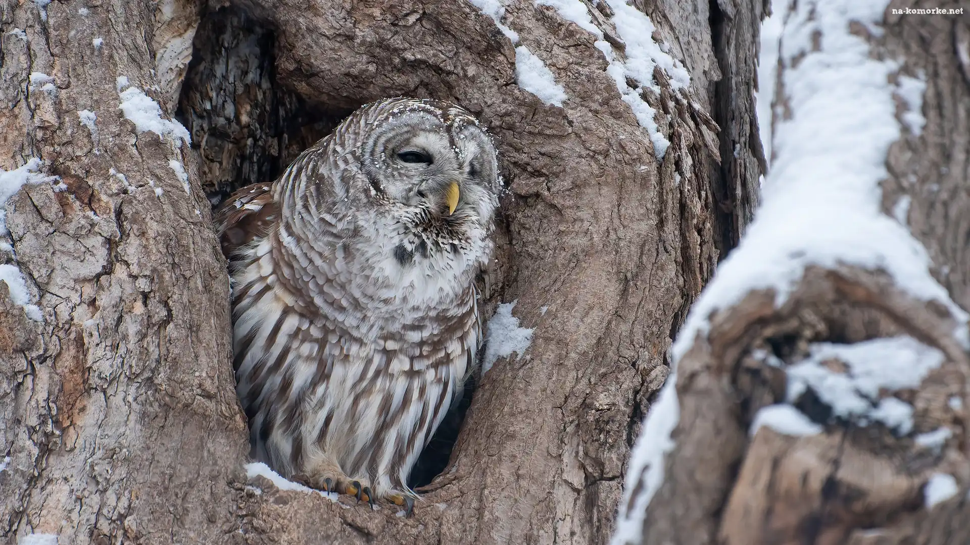 Dziupla, Ptak, Drzewo, Śnieg, Puszczyk kreskowany, Sowa na Komórkę