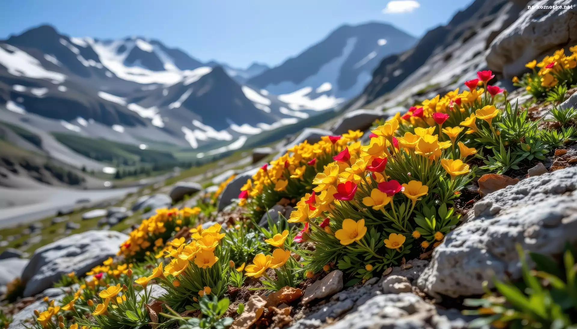 Czerwone, Kamienie, Góry, Grafika AI, Kwiaty, Żółte, Śnieg na Komórkę