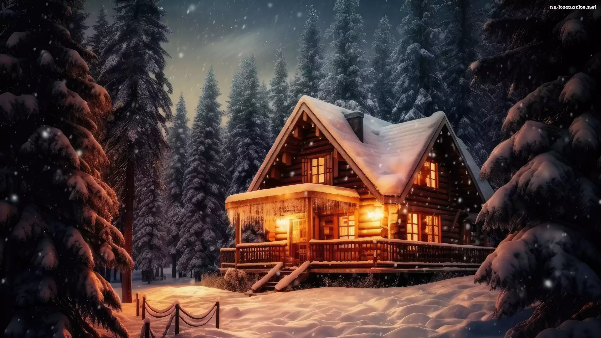Las, Światła, Świerki, Zima, Dom, 2D, Drzewa, Śnieg na Komórkę