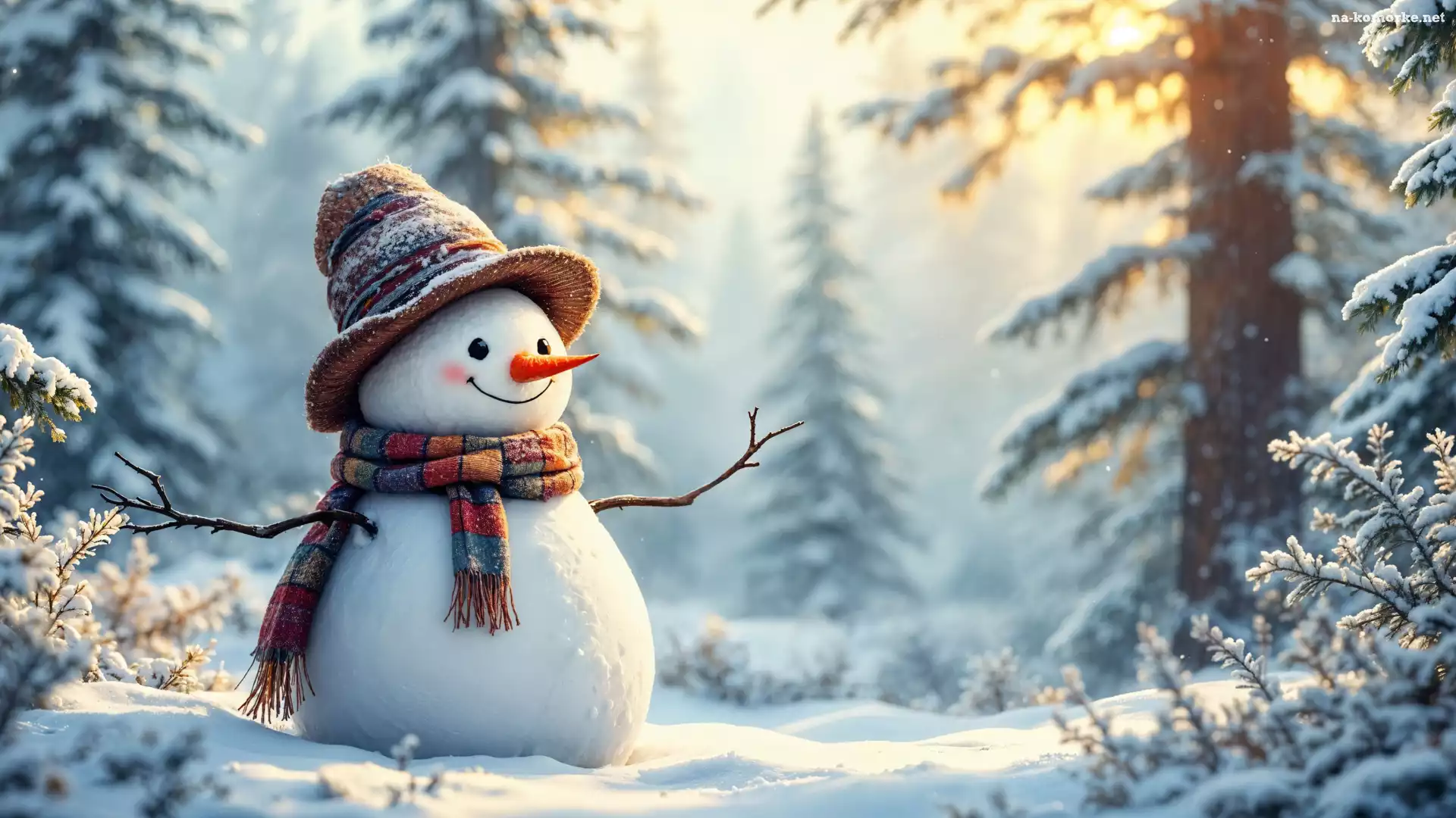 Bałwan, Drzewa, Szalik, Zima, Uśmiech, Słońce, Kapelusz, Śnieg na Komórkę