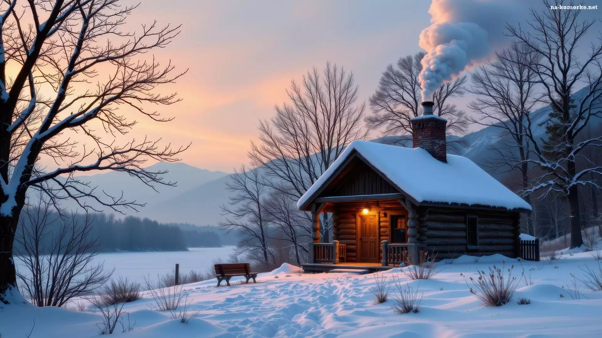 Drzewa, Góry, Zima, Śnieg, Dym, Ławka, Dom na Komórkę