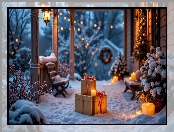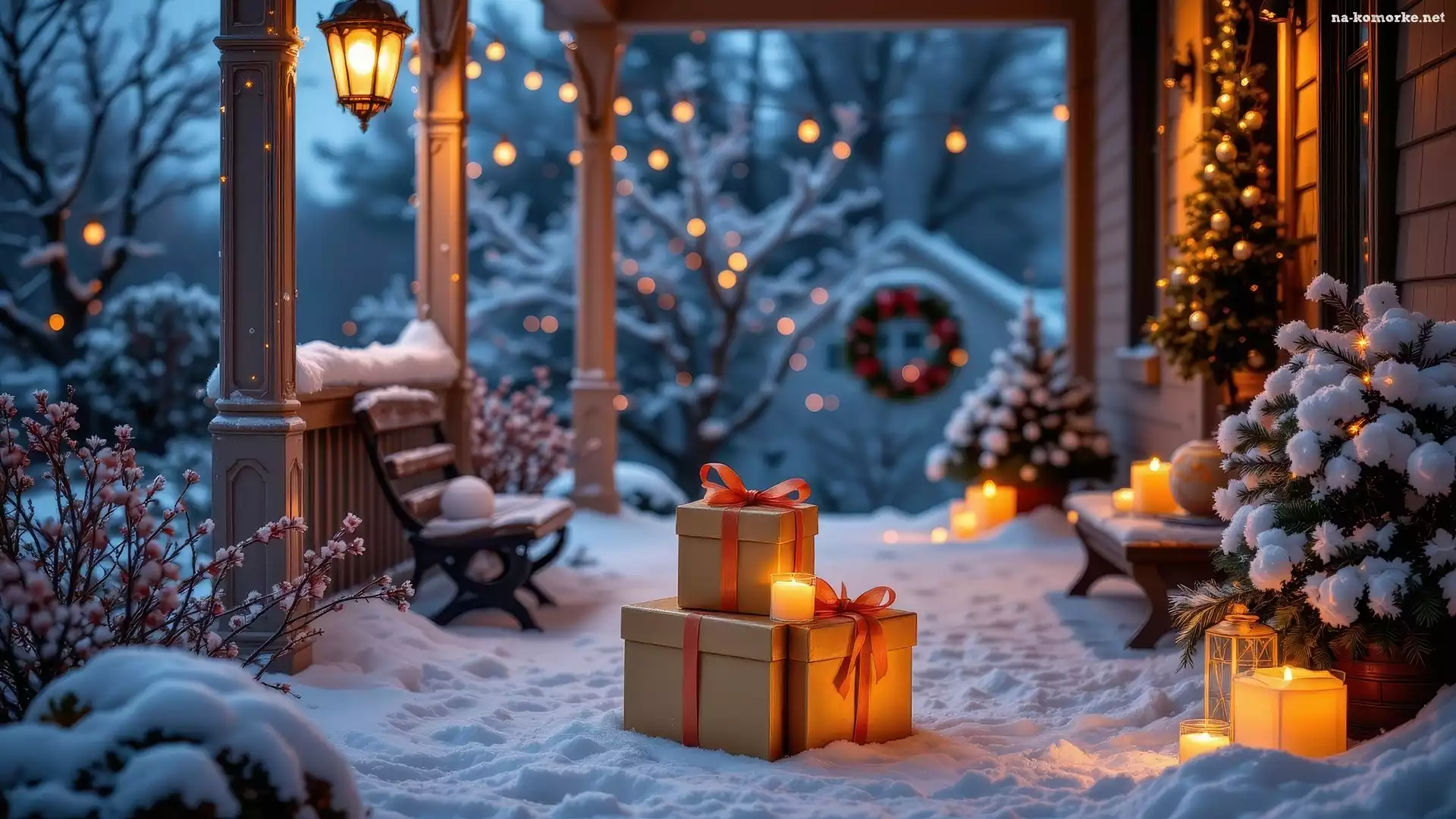 Lampiony, Krzewy, Zima, Boże Narodzenie, Ławki, Prezenty, Śnieg na Komórkę