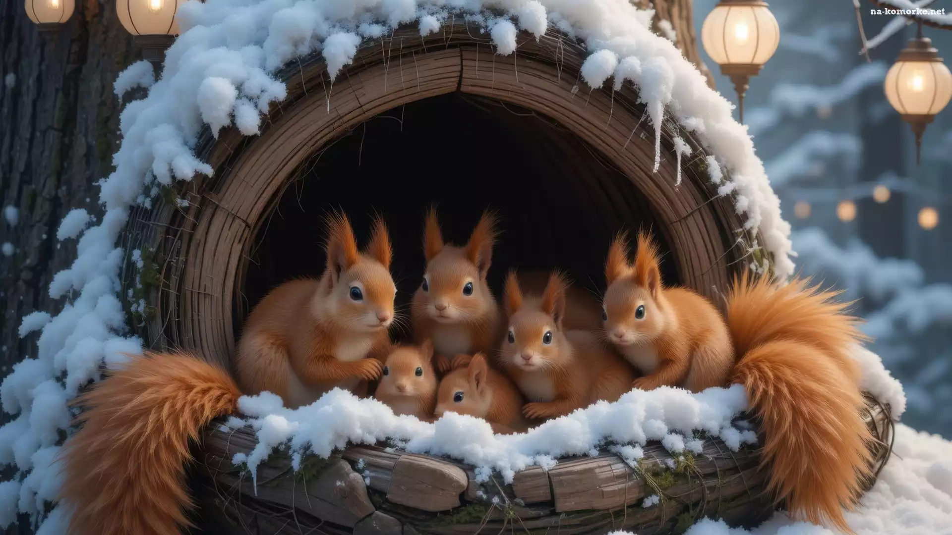 Wiewiórki, Śnieg, Zima, Dziupla, Lampiony na Komórkę
