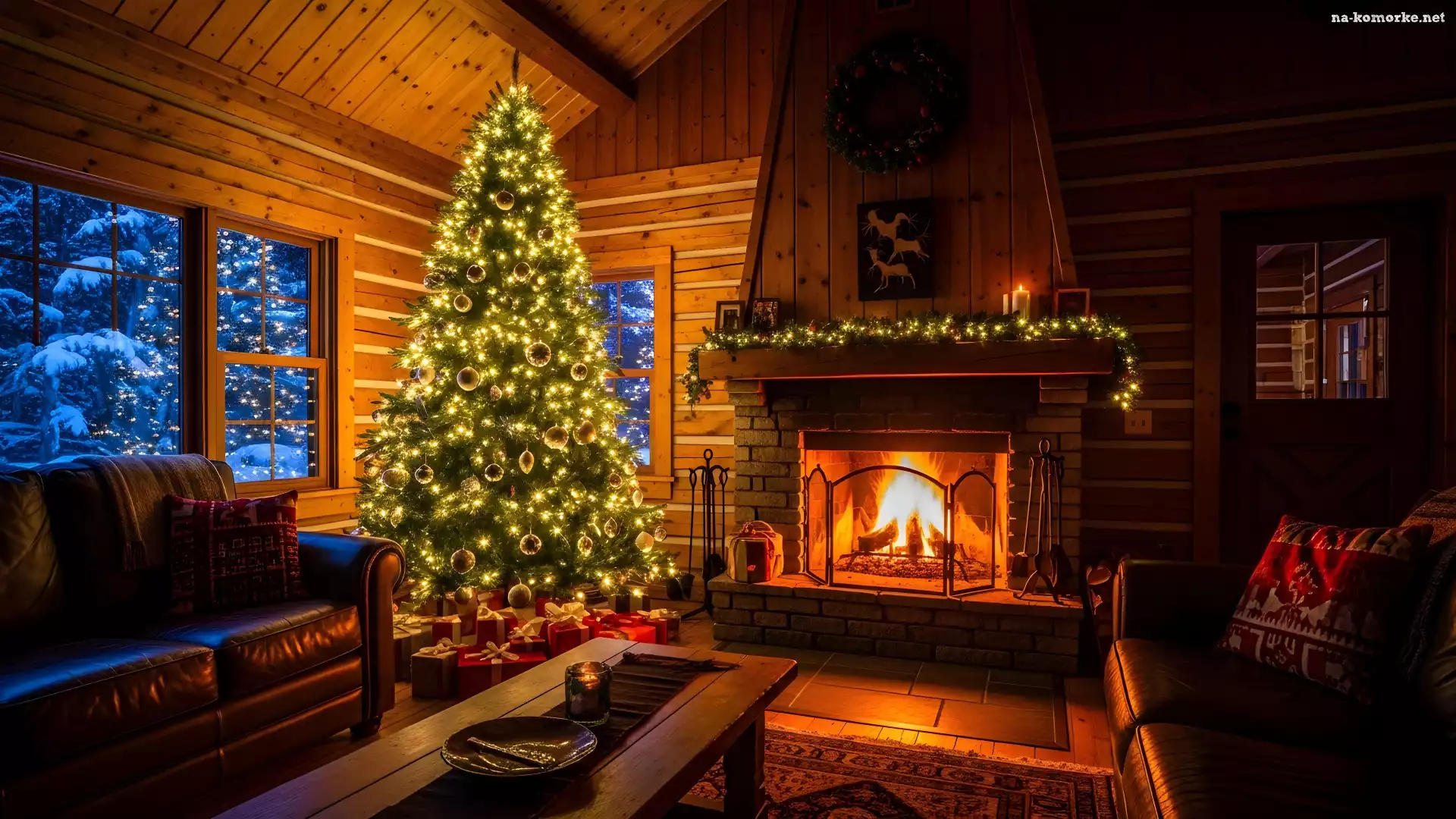 Sofa, Kominek, Boże Narodzenie, Prezenty, Choinka, Udekorowana, Pokój, Wieniec, Okno na Komórkę