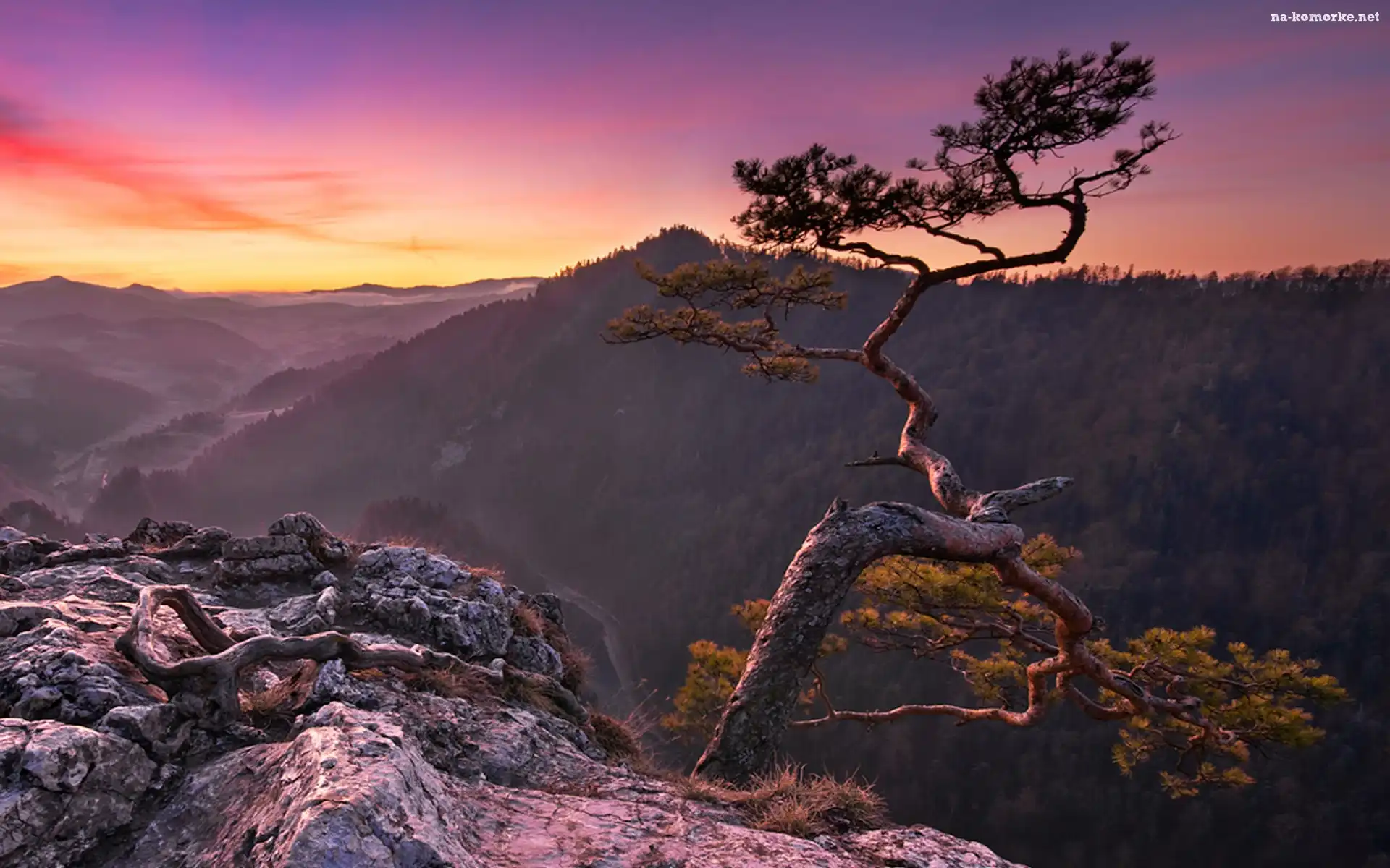 Góry, Sokolica, Pieniny, Skała, Sosna, Niebo, Zachód Słońca na Komórkę