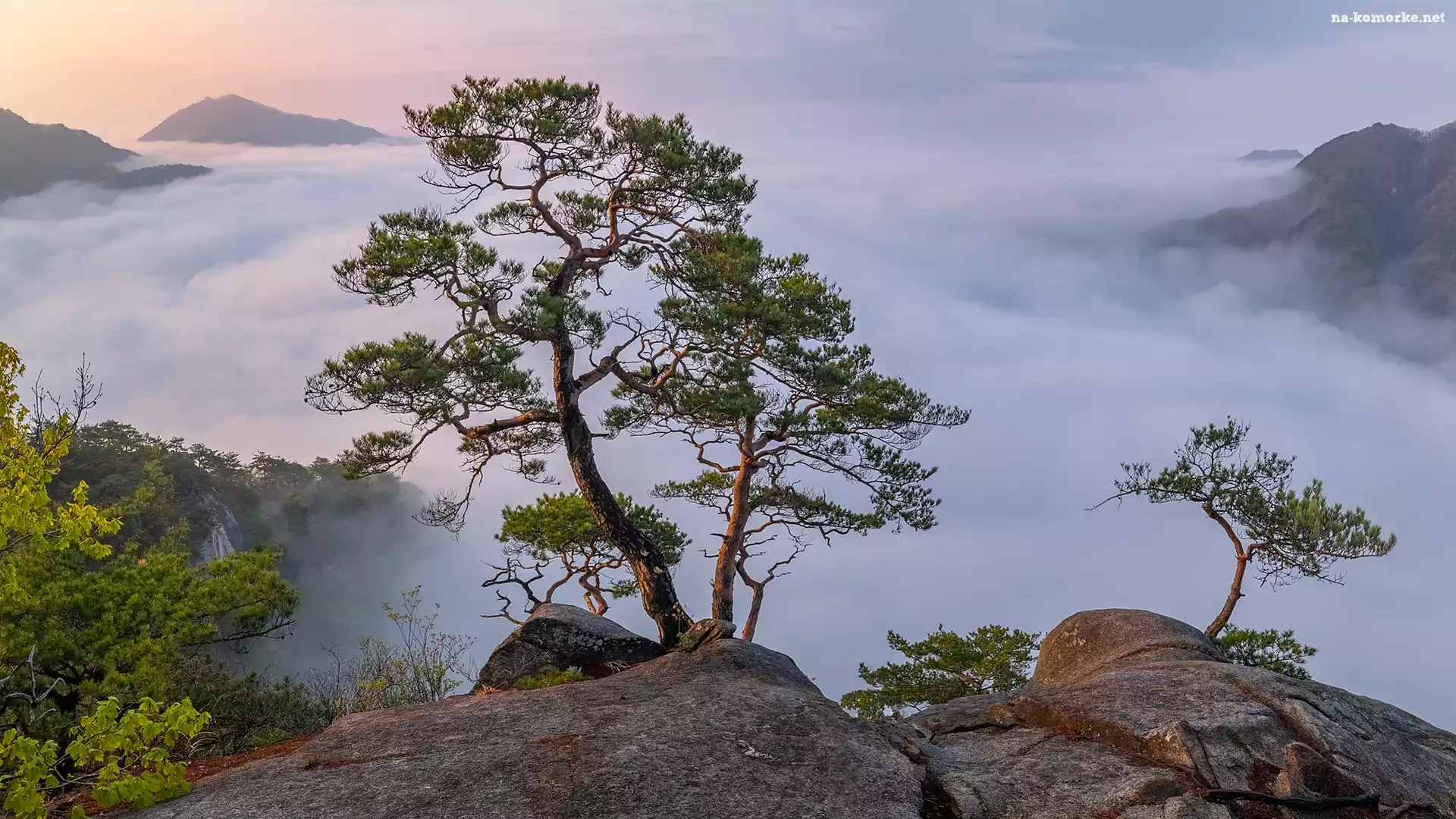 Skały, Mgła, Góry, Sosna na Komórkę