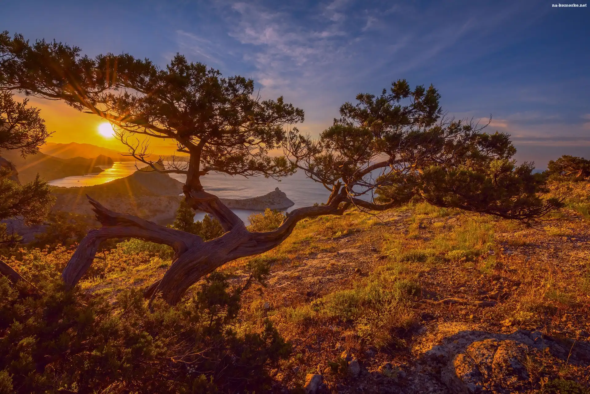 Wybrzeże, Krym, Ukraina, Zachód słońca, Rezerwat botaniczny Nowy Świat, Sosna na Komórkę