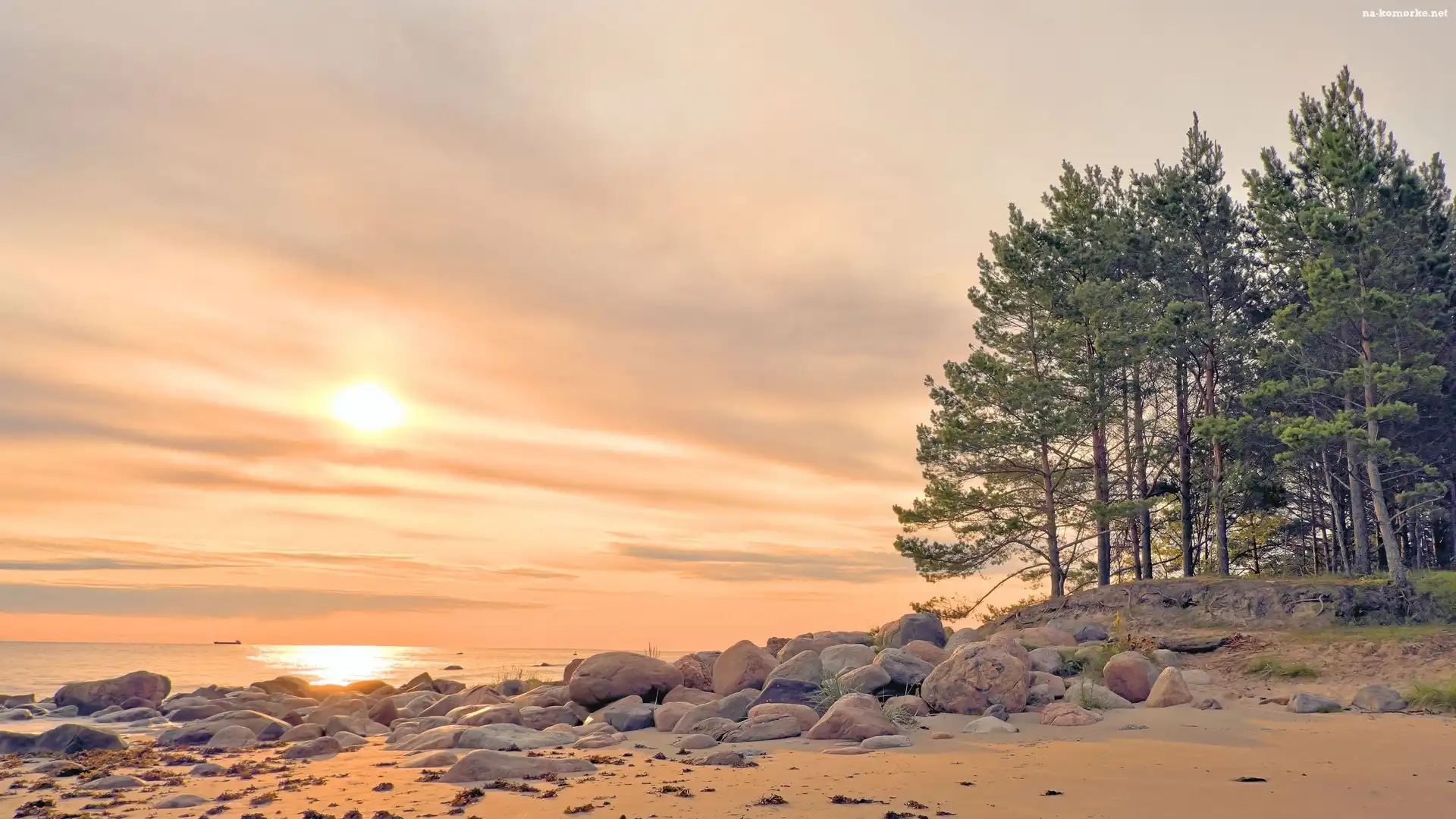 Sosny, Plaża, Kamienie, Morze, Drzewa na Komórkę