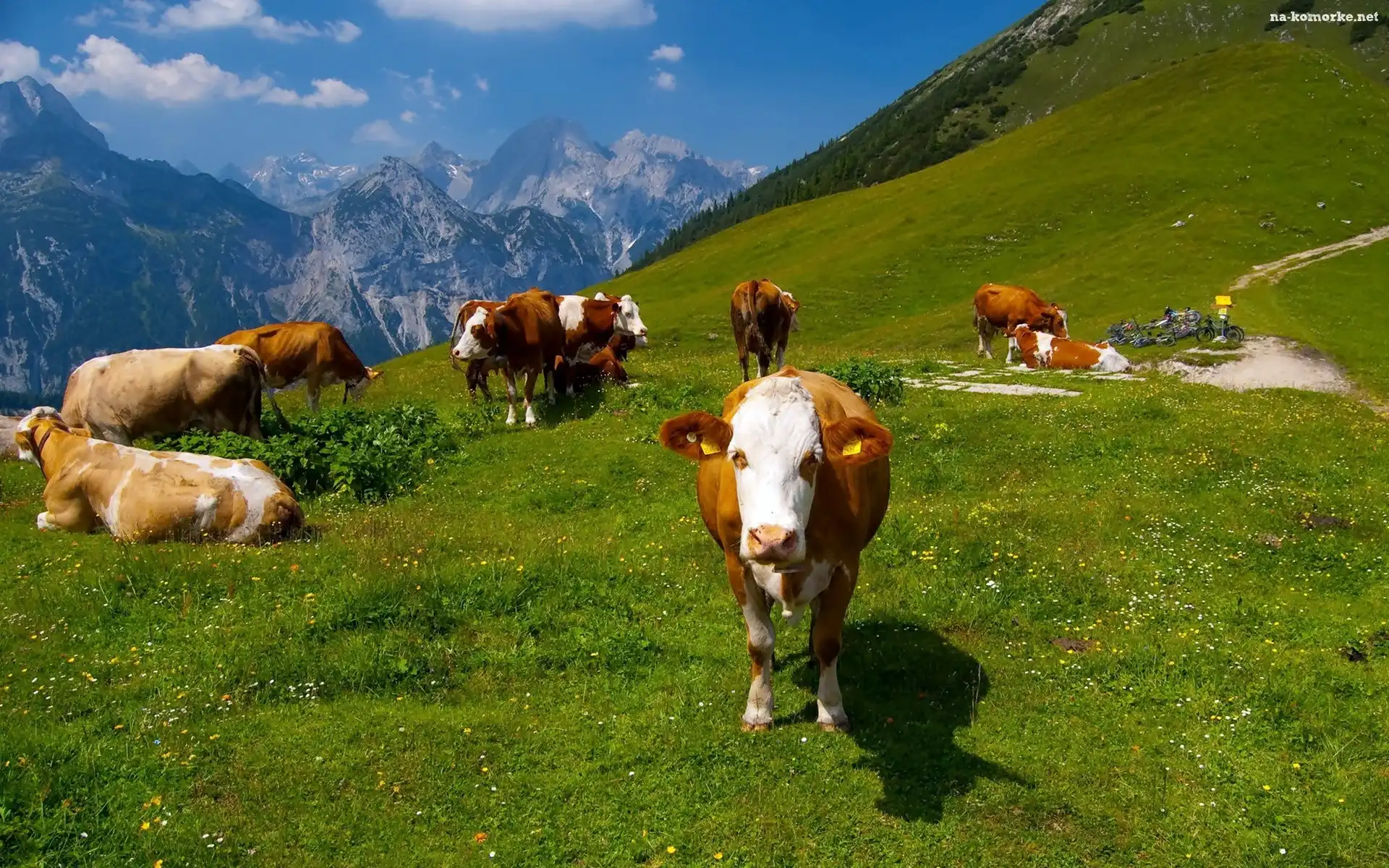 Góry, Rzeka Obraz, Wioska, Indianie Góry, Chmury, Rzeka Chmura Alpy, Chmury, Góry Dmuchawiec, Niebo Jezioro, Odbicie, Lustrzane Łąka, Wiosna, Zielone, Drzewa, Żółta Zachód, Chmury, Słońca, Jezioro Krajobraz, Góry, Tęcza Łąka, Słoneczniki Krowa, Łąka Most, Betonowe, Podpory Wiosna, Płot, Zielona, Trawka