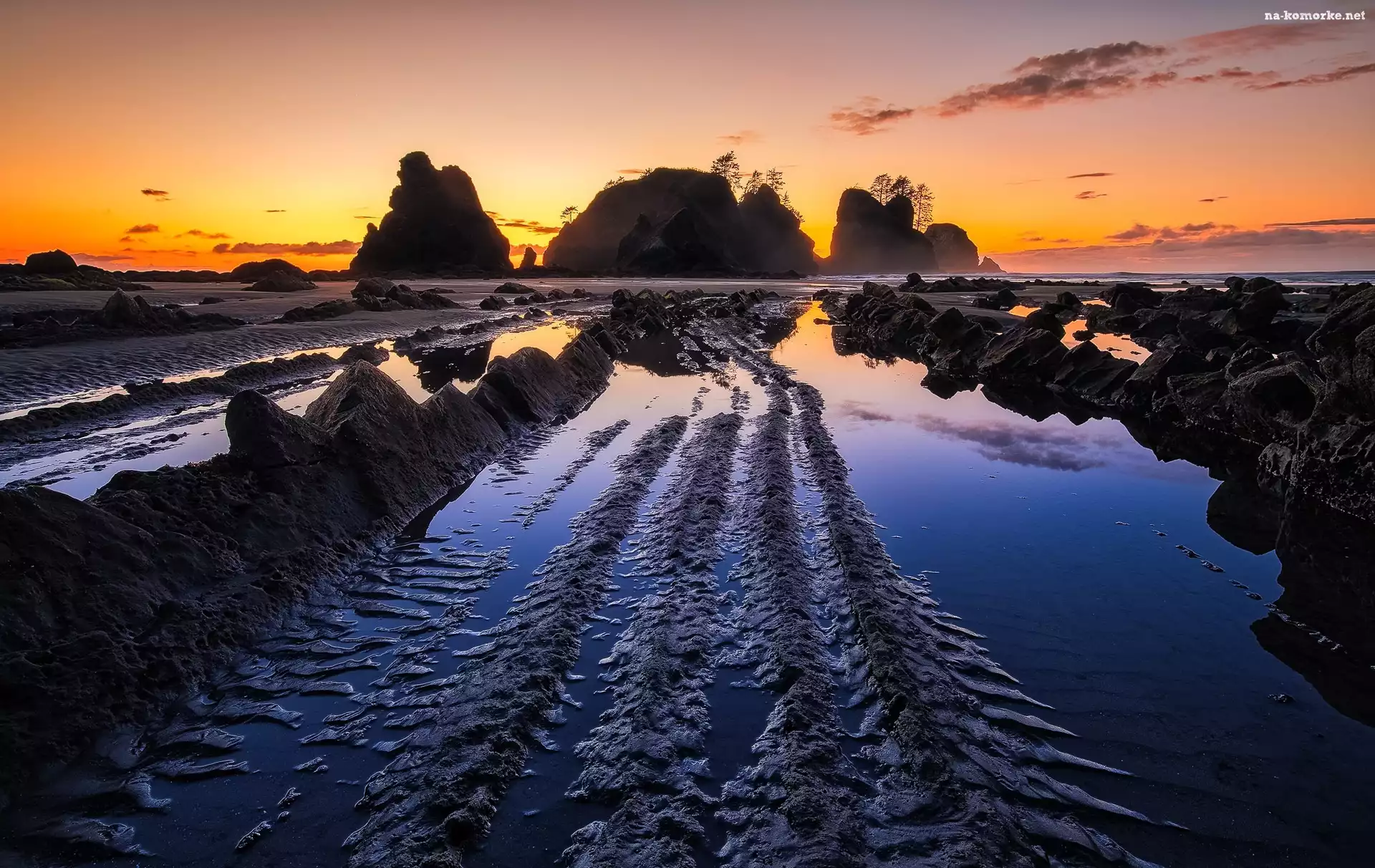 Stan Waszyngton, Plaża Shi Shi Beach, Skały, Stany Zjednoczone, Park Narodowy Olympic, Hrabstwo Clallam, Zachód słońca, Piasek, Morze na Komórkę |
