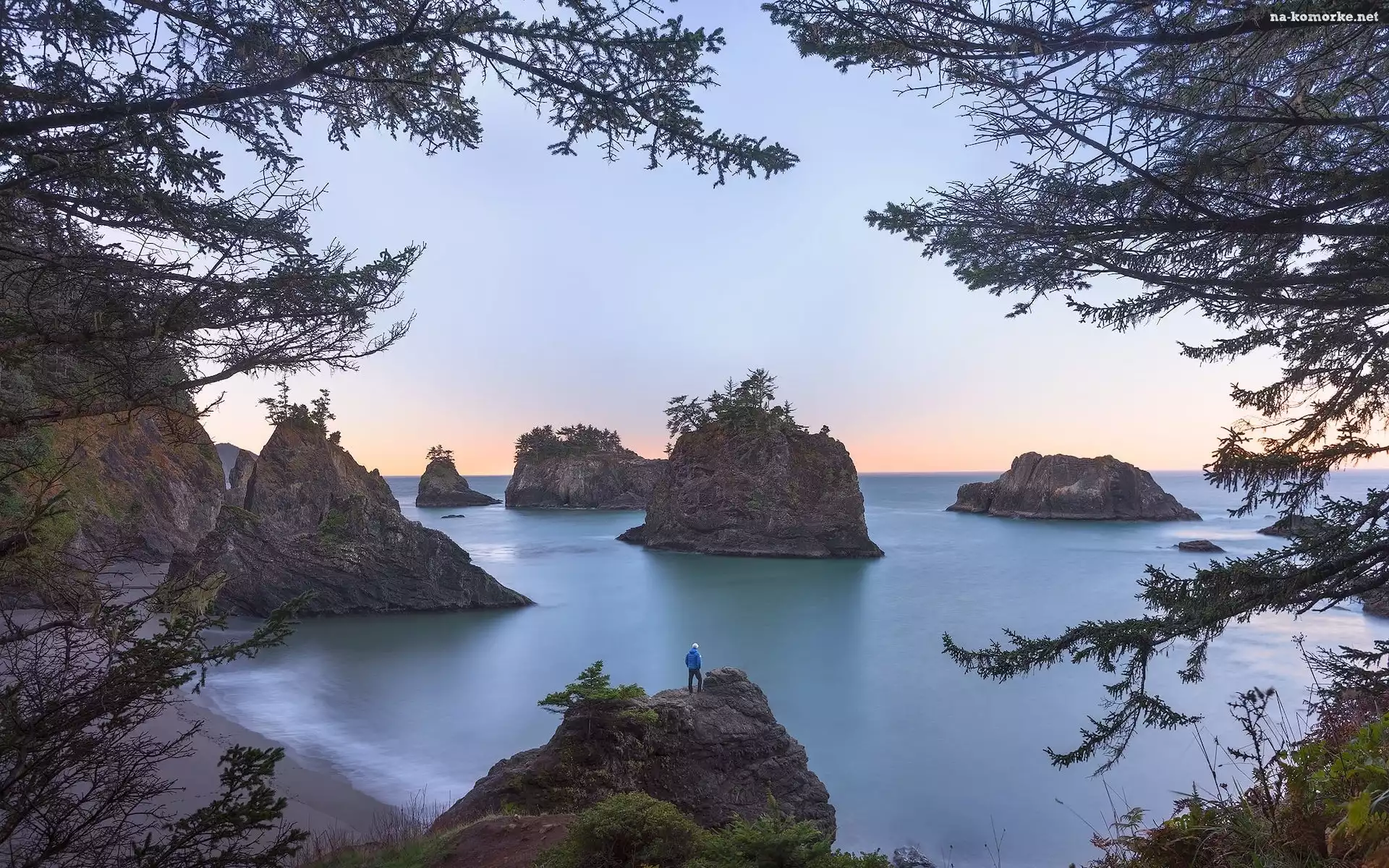 Stany Zjednoczone, Secret Beach, Człowiek, Plaża, Wybrzeże, Gałęzie, Stan Oregon, Morze, Skały, Drzewa na Komórkę |