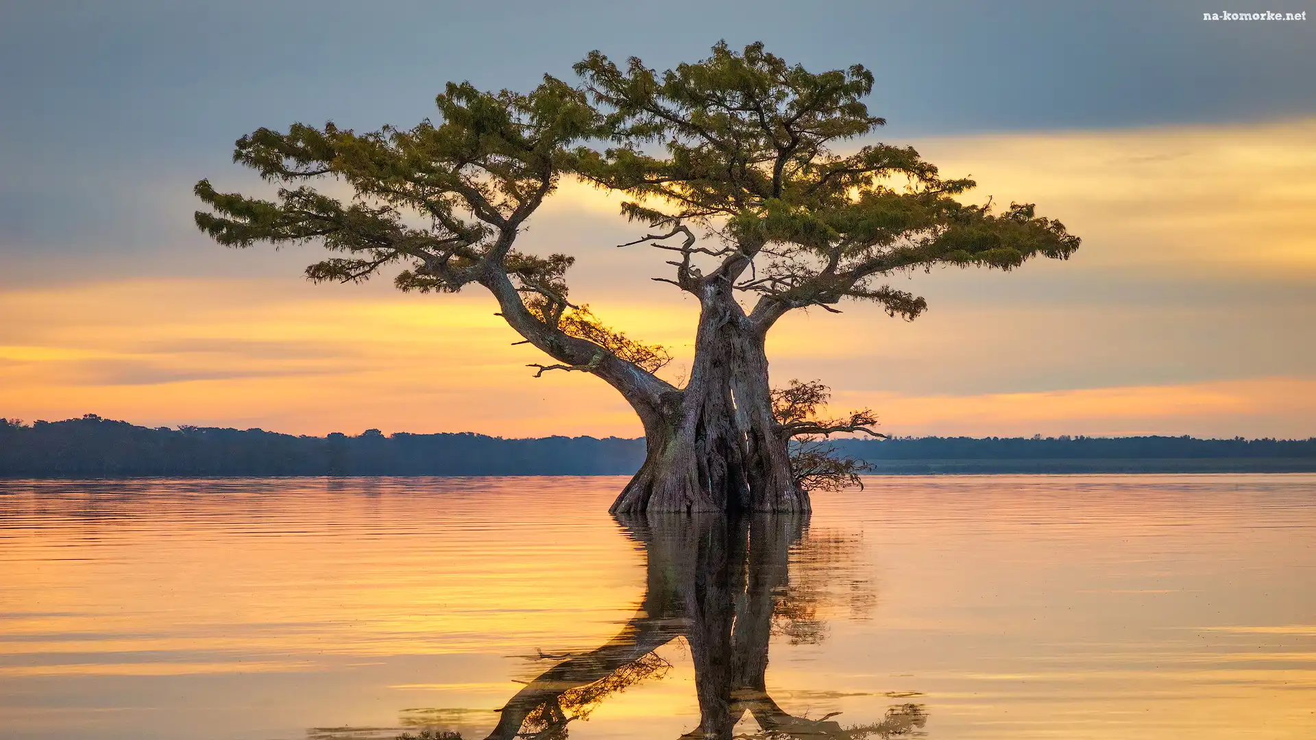 Cyprys, Wschód słońca, Mokradło, Odbicie, Stany Zjednoczone, Drzewo, Luizjana, Bagno, Atchafalaya Basin na Komórkę |
