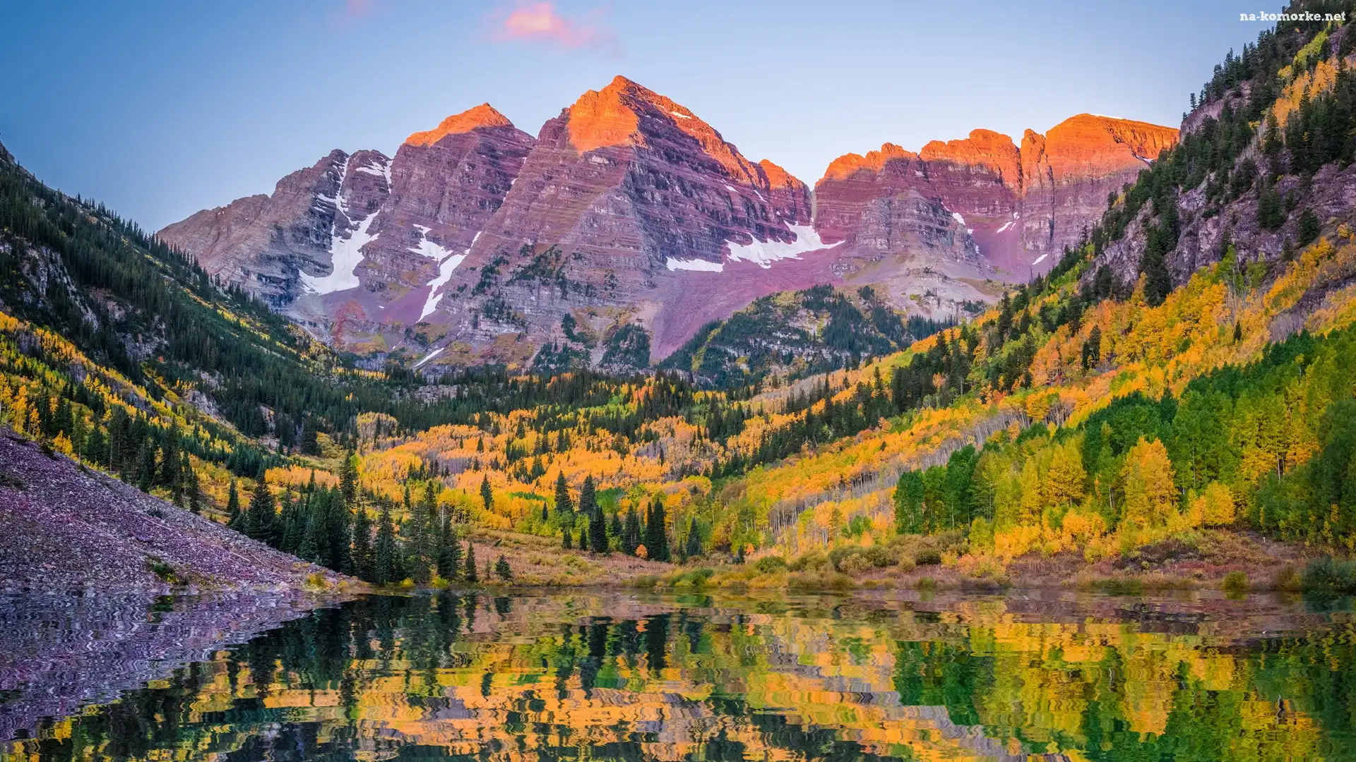 Góry Skaliste, Stan Kolorado, Stany Zjednoczone, Szczyty Maroon Bells, Jezioro Maroon Lake, Odbicie, Drzewa na Komórkę |