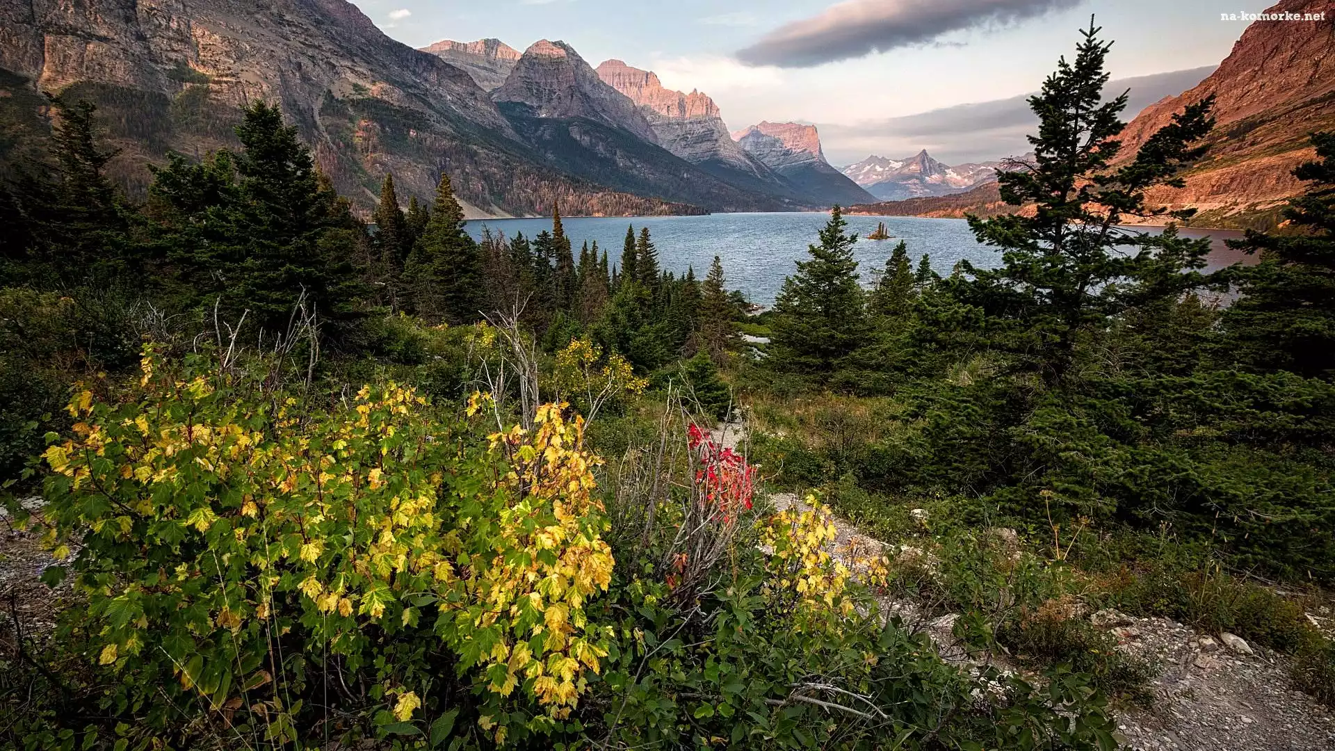 Góry Skaliste, Stan Montana, Stany Zjednoczone, Jezioro, Saint Mary Lake, Drzewa, Park Narodowy Glacier na Komórkę |