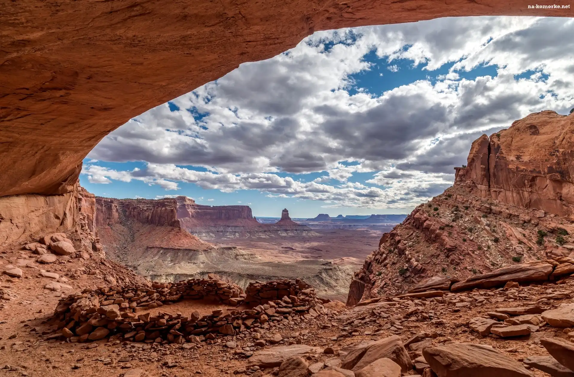 Stany Zjednoczone, Niebo, Park Narodowy Canyonlands, Chmury, Stan Utah, Krąg kamienny False Kiva, Kanion, Skały na Komórkę |