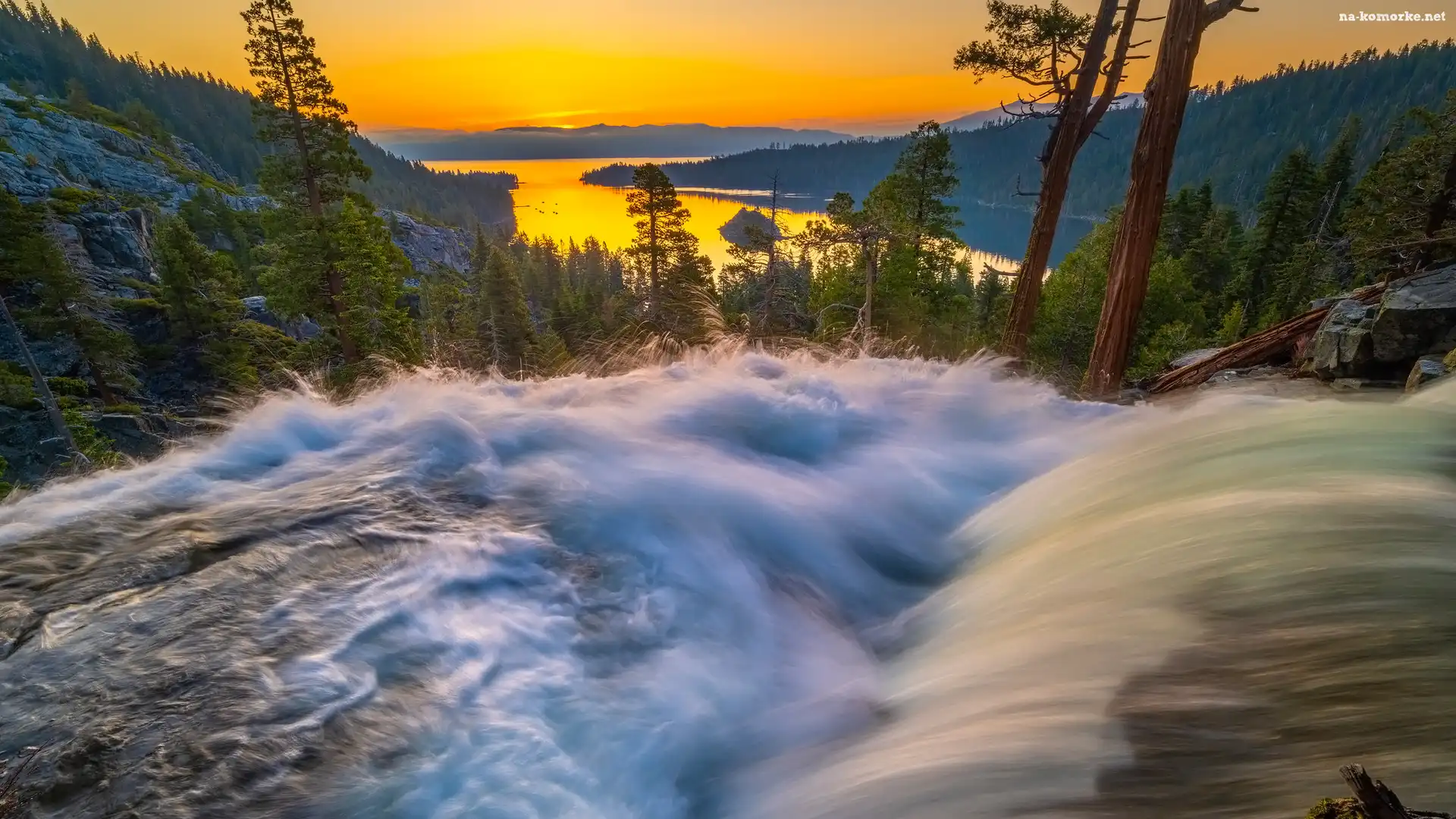 Zachód słońca, Rzeka, Stany Zjednoczone, Sierra Nevada, Góry, Tahoe Lake, Jezioro, Drzewa, Kalifornia na Komórkę |