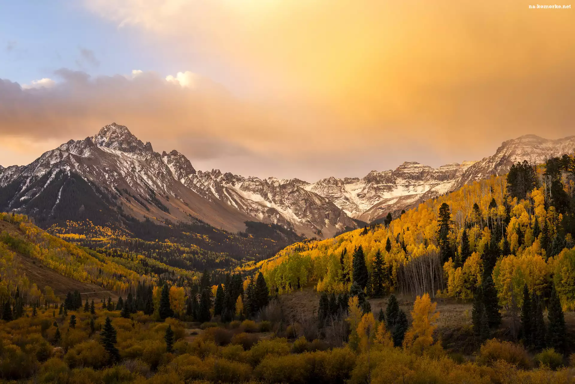 Wschód słońca, Góry, Stany Zjednoczone, Las, Drzewa, Kolorowe, Jesień, Mount Sneffels, Stan Kolorado na Komórkę |