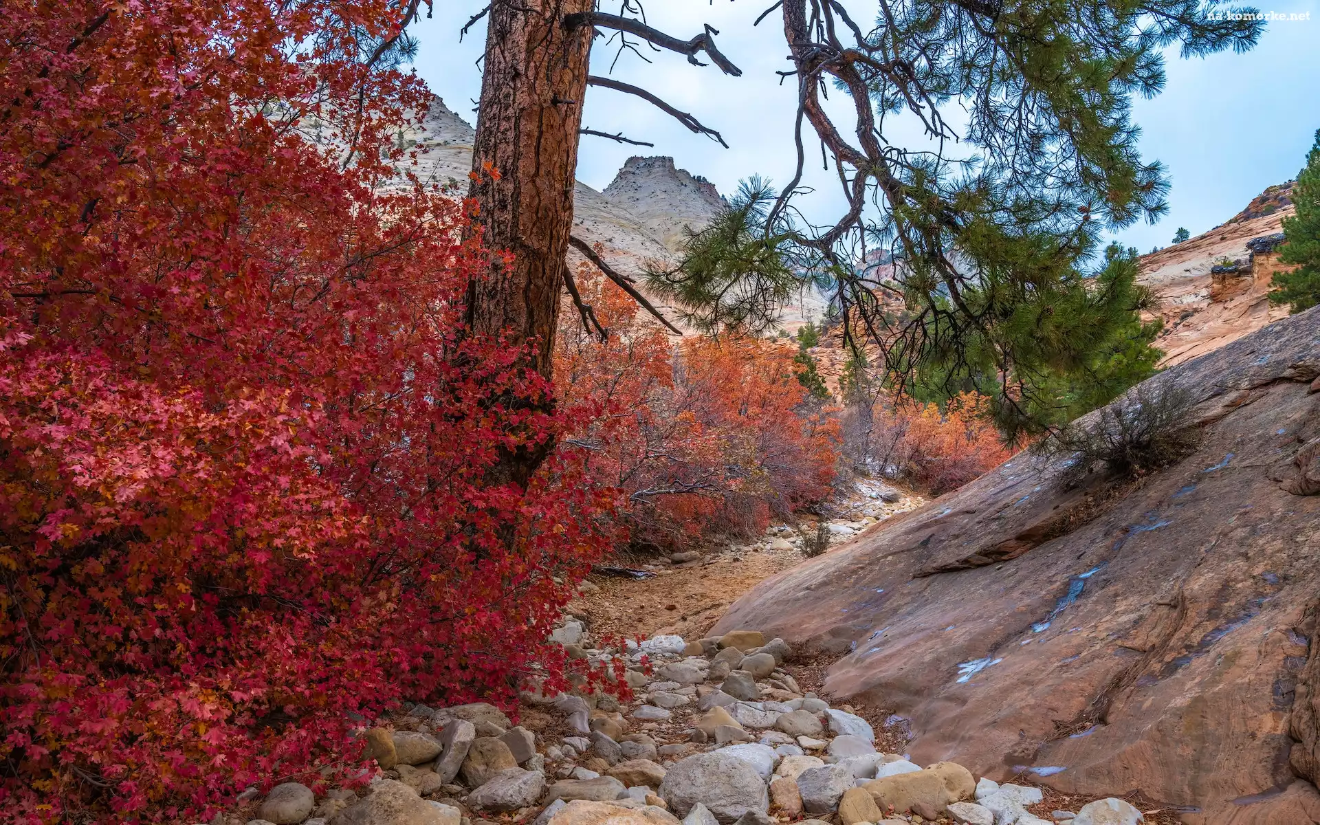Stany Zjednoczone, Park Narodowy Zion, Roślinność, Jesień, Krzew, Stan Utah, Czerwony, Skały, Drzewo na Komórkę |