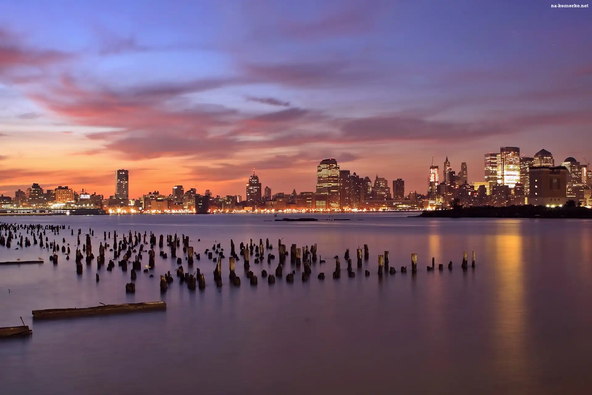 Zdjęcie Miasta, Stany Zjednoczone, New Jersey, Rzeka, Drapacze Chmur, Zachód Słońca na Komórkę