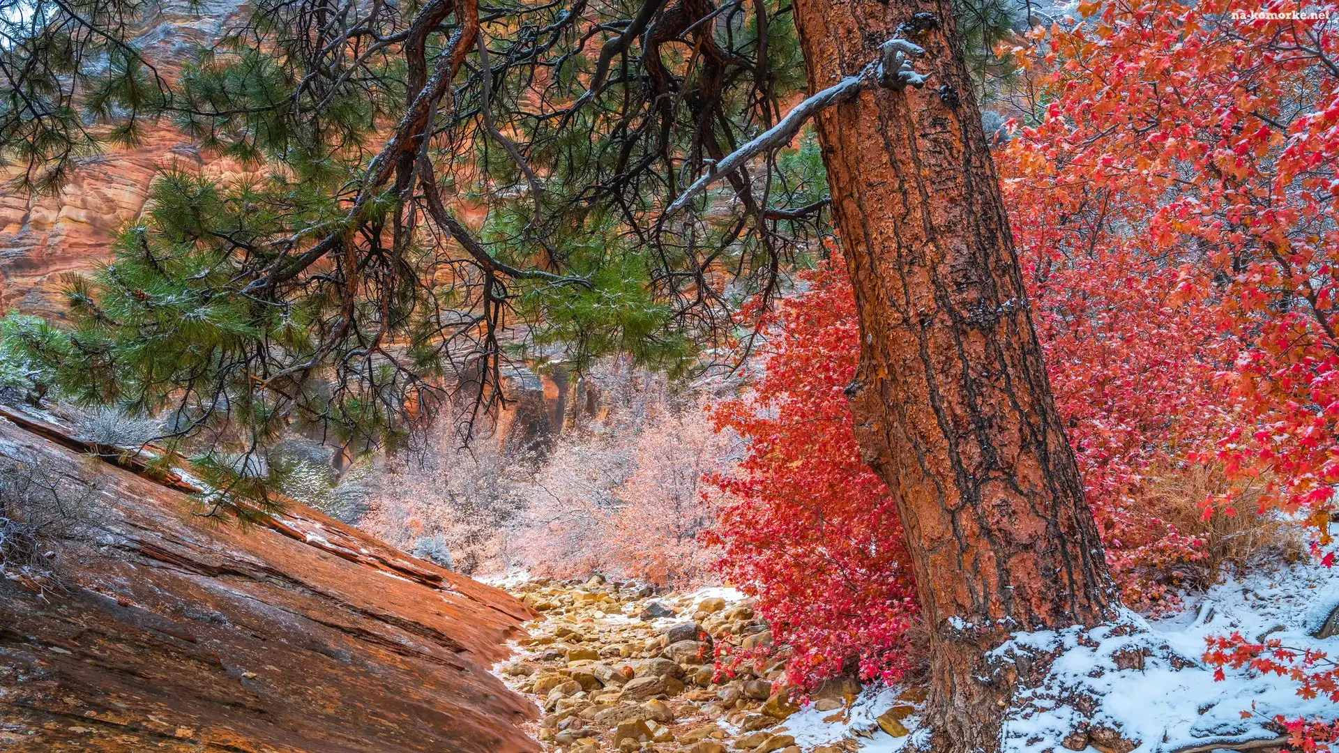 Park Narodowy Zion, Roślinność, Stany Zjednoczone, Skały, Stan Utah, Krzew, Jesień, Drzewo, Sosna, Czerwony na Komórkę |