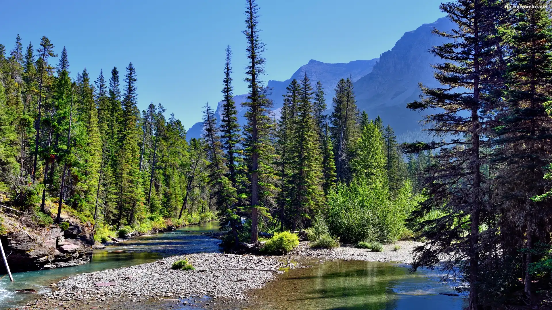 Drzewa, Stany Zjednoczone, Park Narodowy Glacier, Góry, Rzeka na Komórkę
