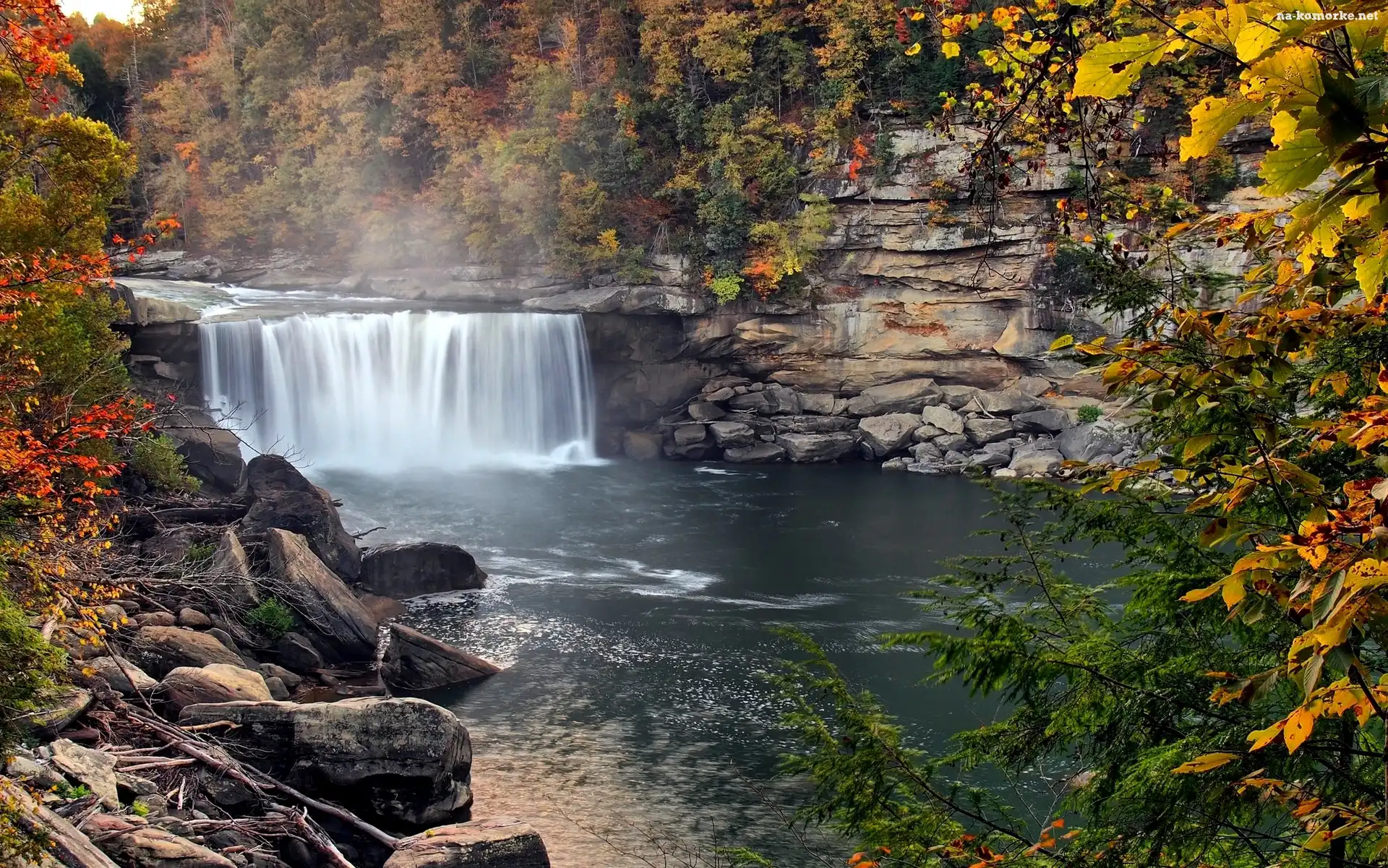 Stany Zjednoczone, Drzewa, Park Narodowy Cumberland Falls, Kamienie, Stan Kentucky, Wodospad Cumberland, Skały, Rzeka Cumberland na Komórkę |