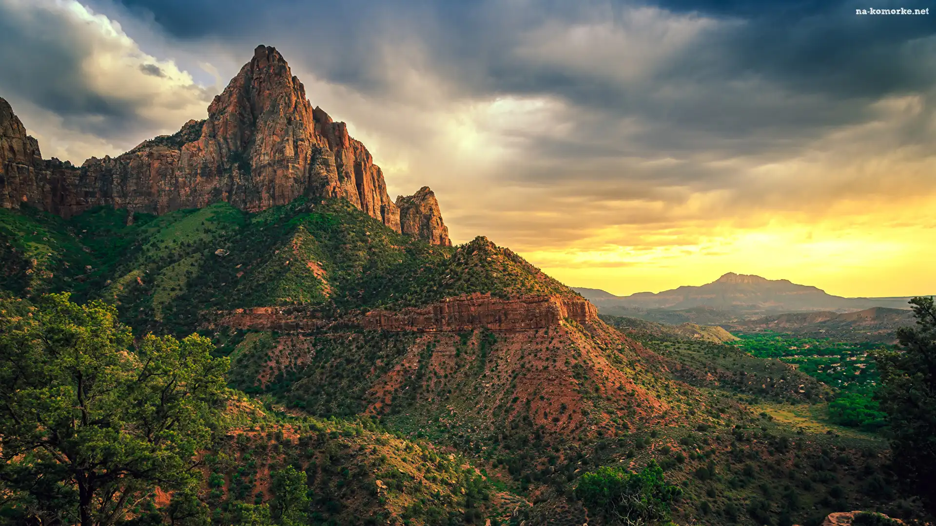 Stany Zjednoczone, Wschód słońca, Park Narodowy Zion, Chmury, Stan Utah, Góry, Drzewa, Krzewy na Komórkę |