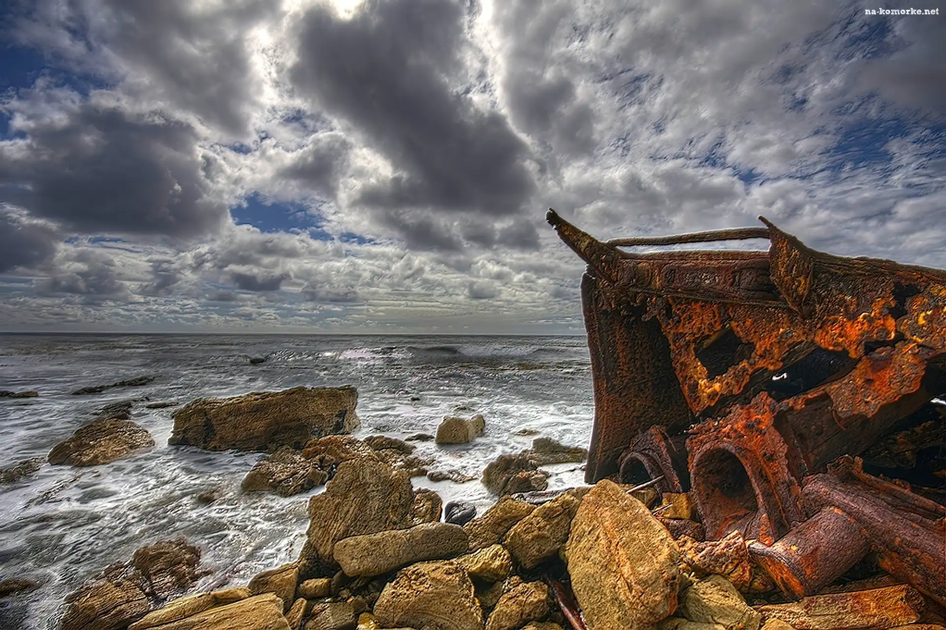 Statku, Morze, Skały, Chmury, Wrak na Komórkę