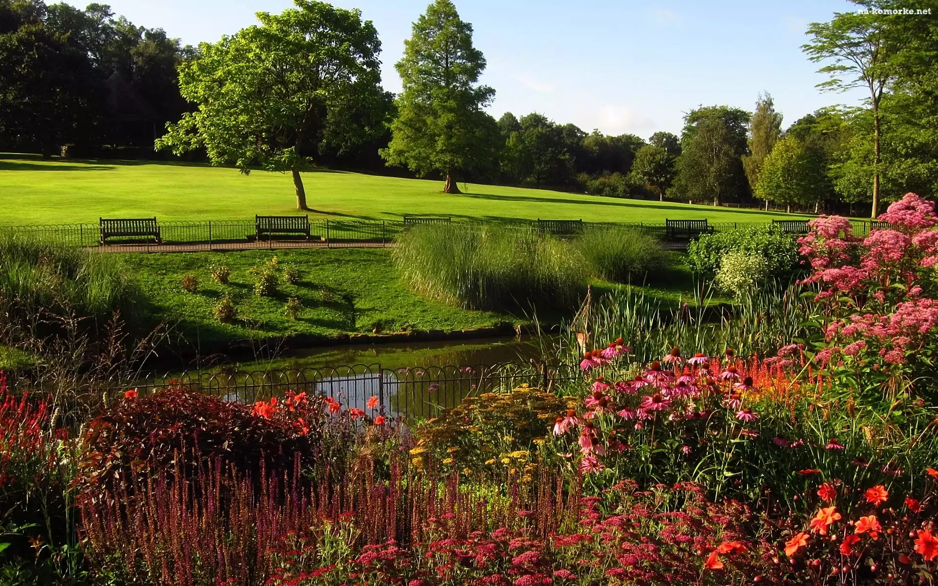 Kwiaty Staw, Anglia, Londyn, Park Hampstead Heath, Ławki na Komórkę