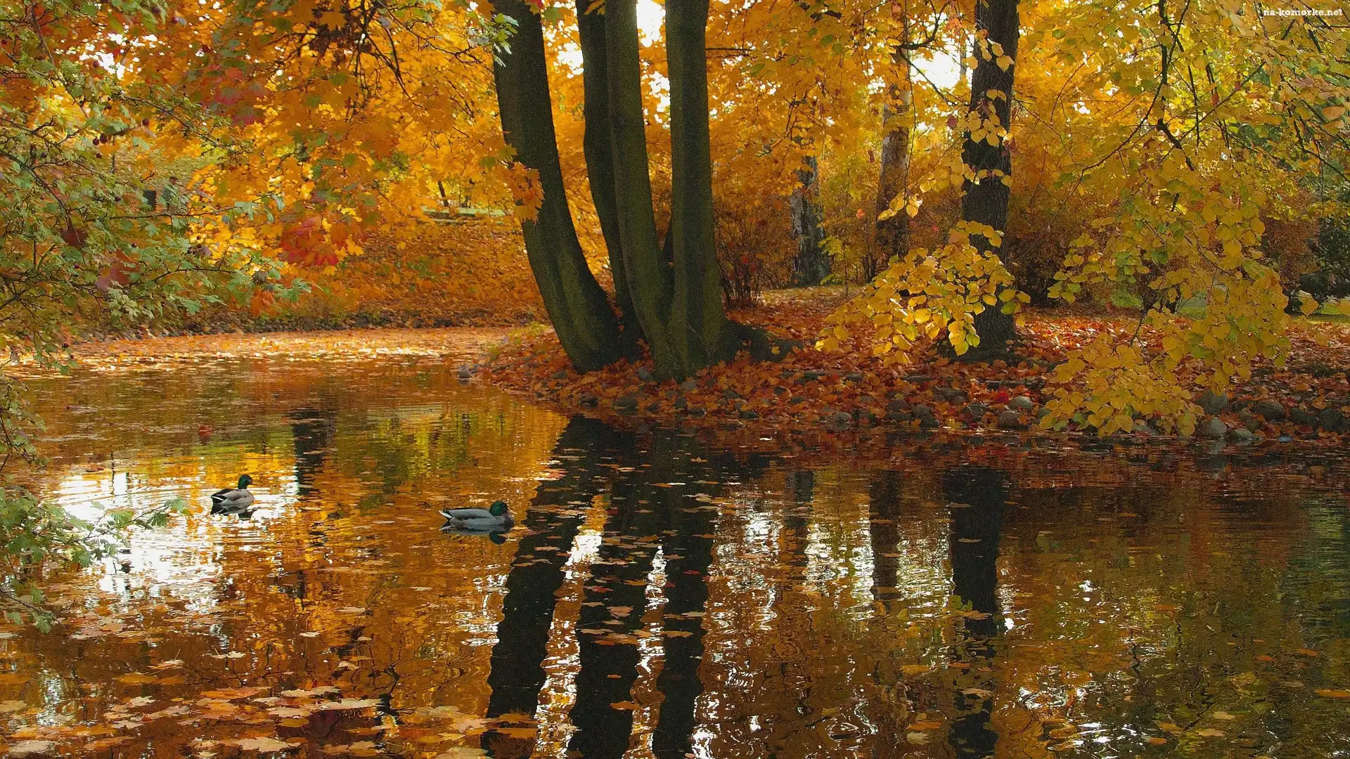 Staw, Jesień, Odbicie, Drzewa, Kaczki na Komórkę