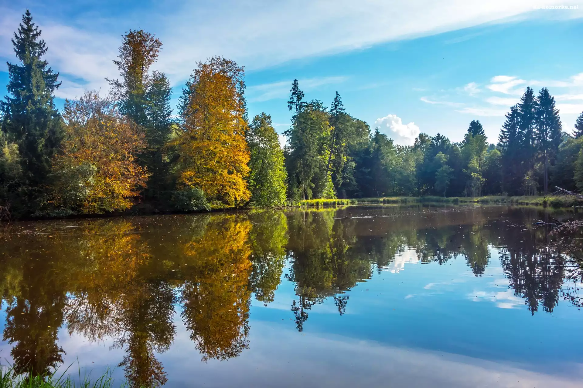 Drzewa, Staw, Odbicie, Las, Jesień na Komórkę