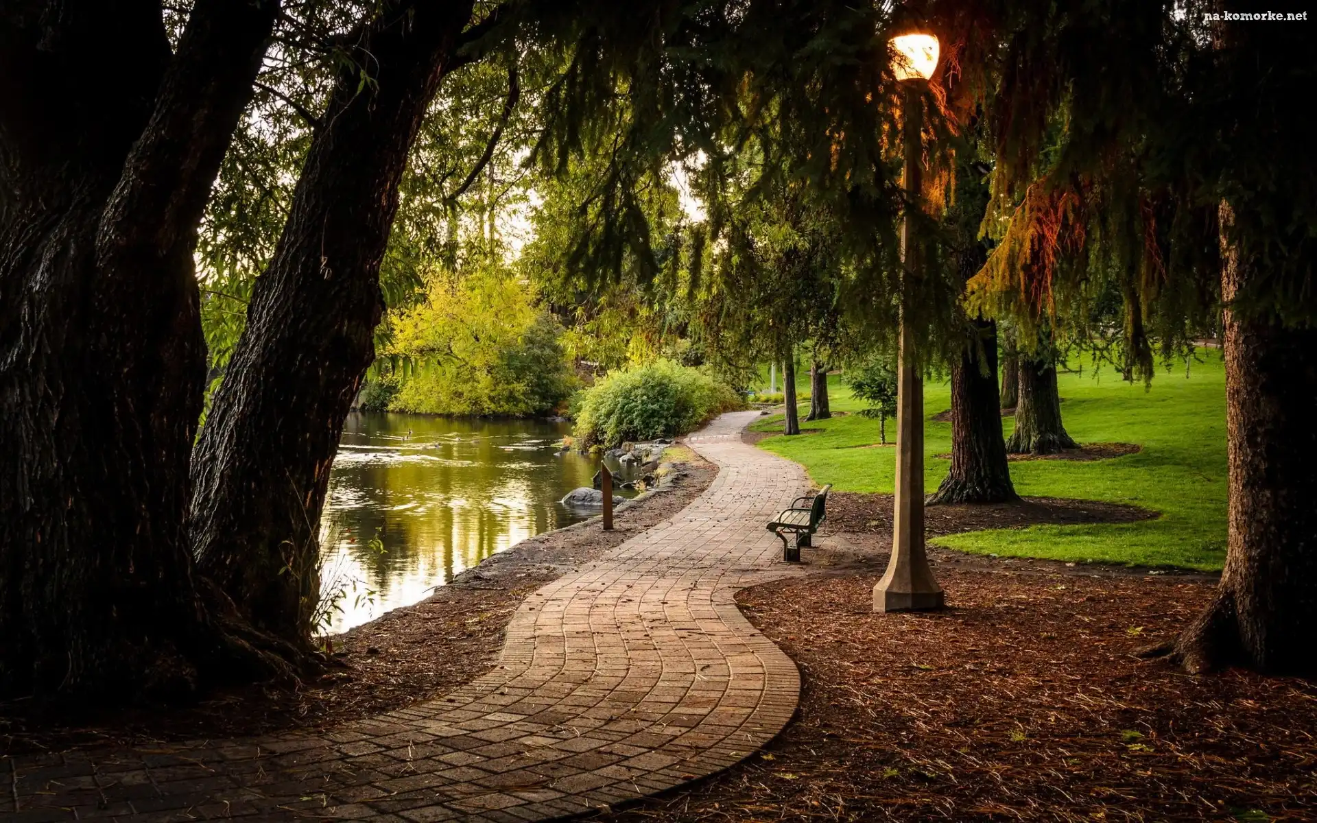 Ławki, Park, Alejka, Staw, Latarnia na Komórkę