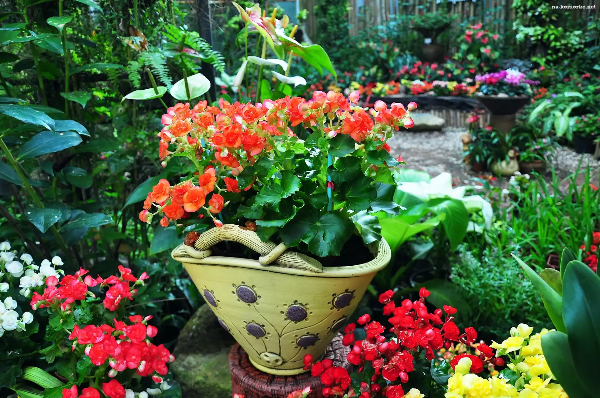 Piękne, Żółte, Kwiaty Staw, Kwiaty, Begonie, Waza, Ogród Kolorowe, Begonie Begonia bulwiasta, Liście, Białe, Kwiaty Piękna, Czerwona, Begonia Dekoracja, Dom, Ogród, Begonie, Schody, Kwiaty Kwiaty, Begonia Liście, Donica, Kwitnące, Begonie Kwiaty, Balkonowe, Czerwone Begonia